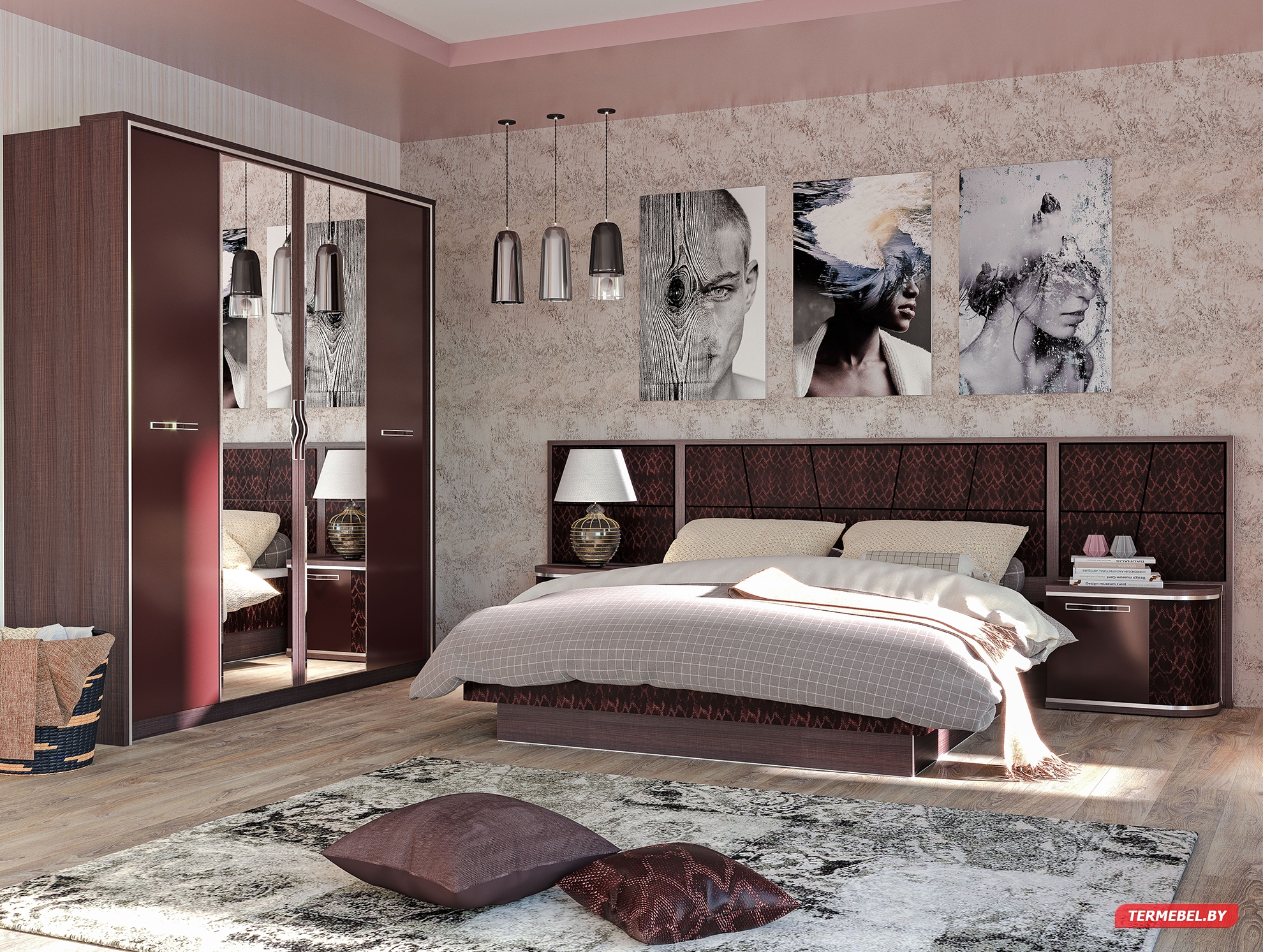 Модульная коллекция мебели для обустройства спальной комнаты. Материал: ЛДСП, МДФ покрытый плёнкой.