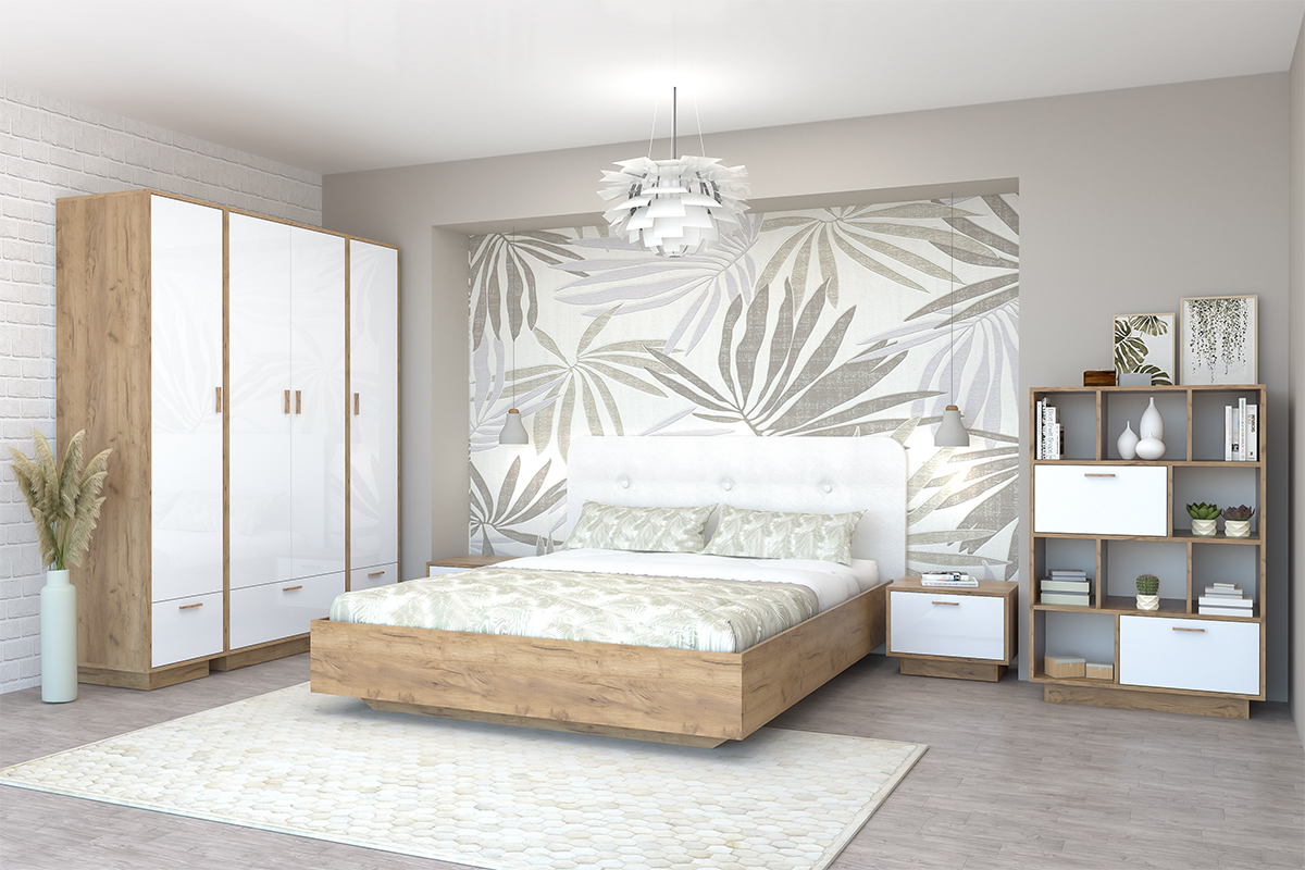 Современный комплект мебели в спальню в двухцветном оформлении.