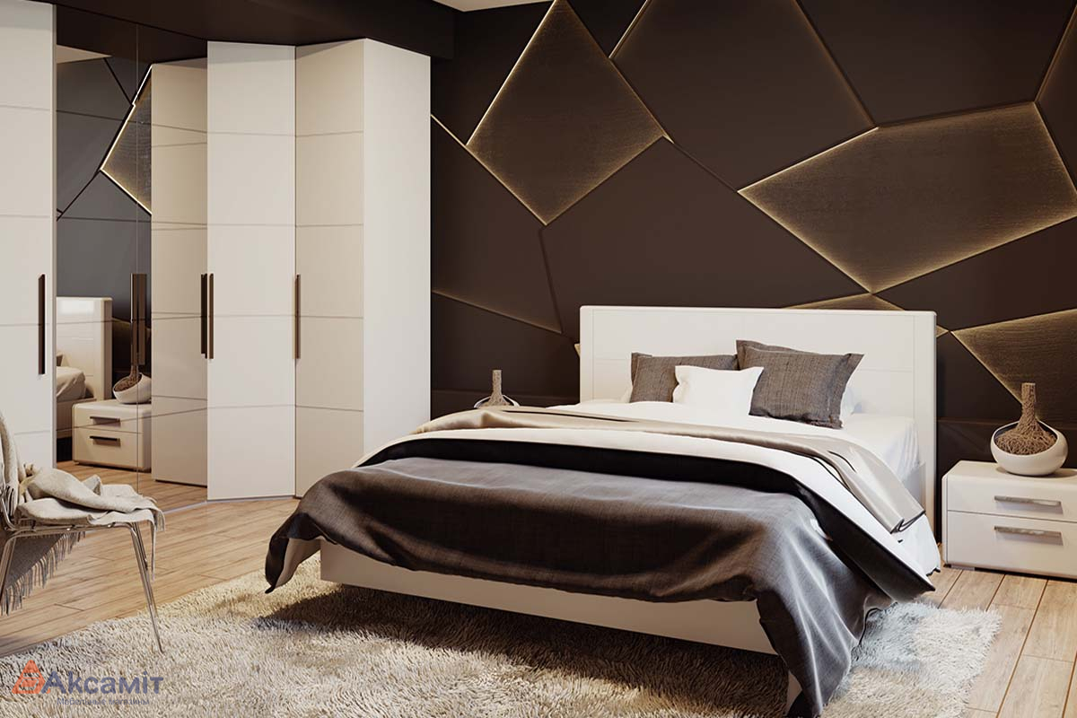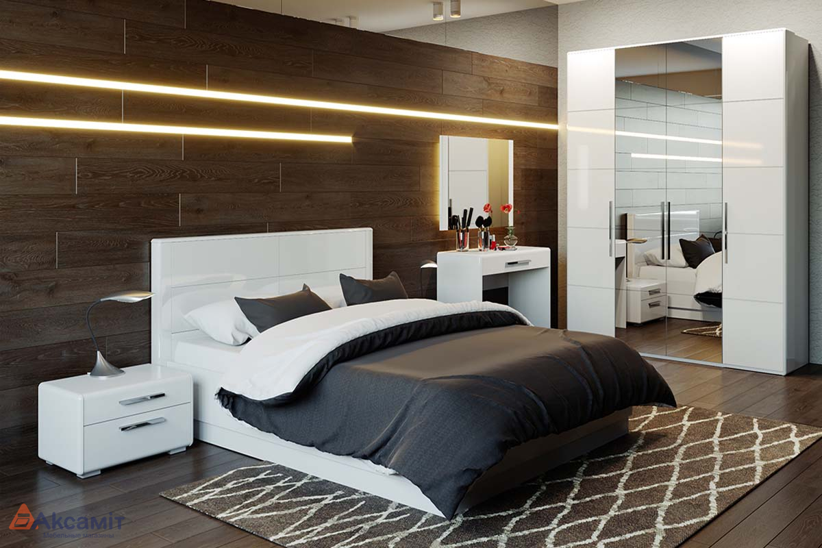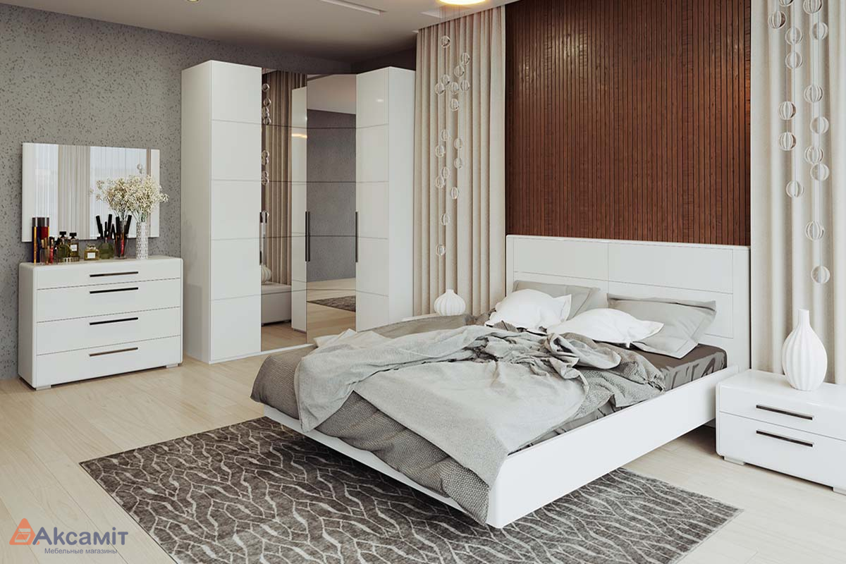 - Глянцевая поверхность фасадов «Наоми» поможет обеспечить отражающий эффект, который расширит пространство комнаты и сделает спальню намного светлее.