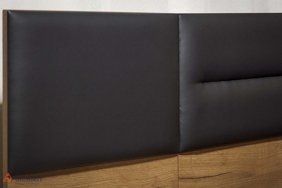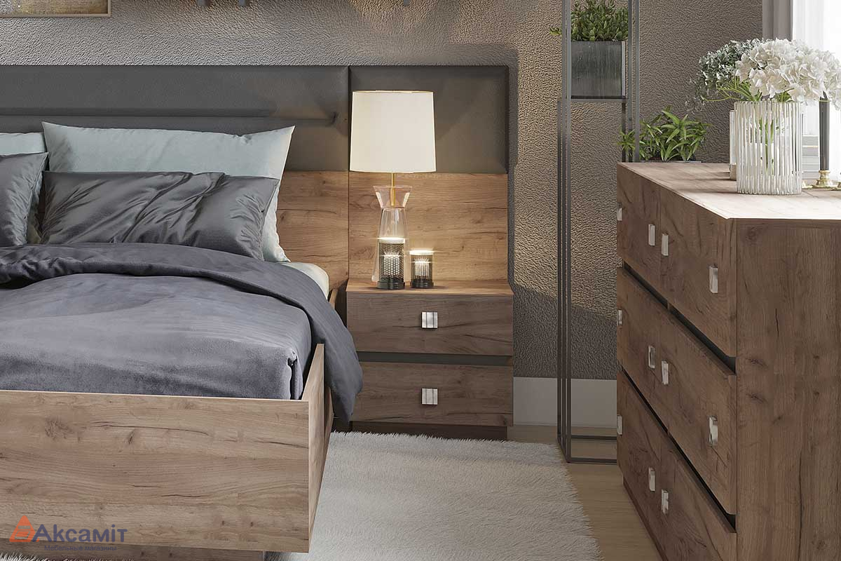 Спальня выполнена в модном и современном дизайне с использованием лучших материалов. Использование декора Дуб табачный Craft со вставками из черного придаёт спальне спокойный природный вид.