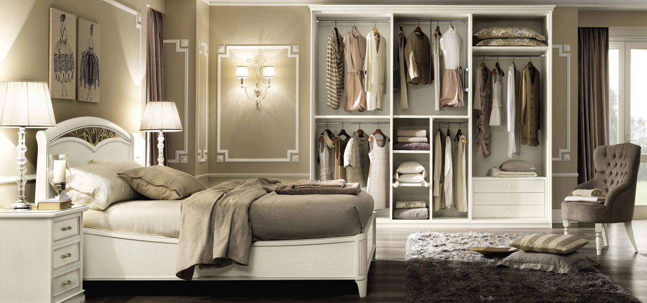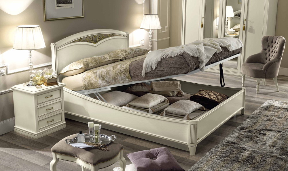 При изготовлении спальни Torriani Avorio используется шпон липы и массив ореха, из которого выполнены карнизы и другие резные декоративные элементы. Кровати имеют художественно перфорированные спинки.