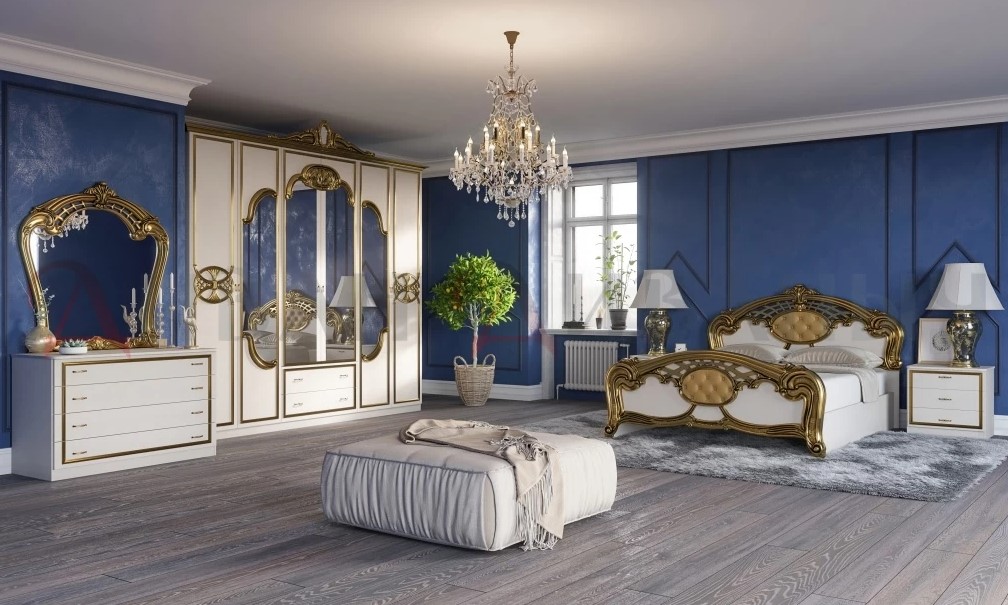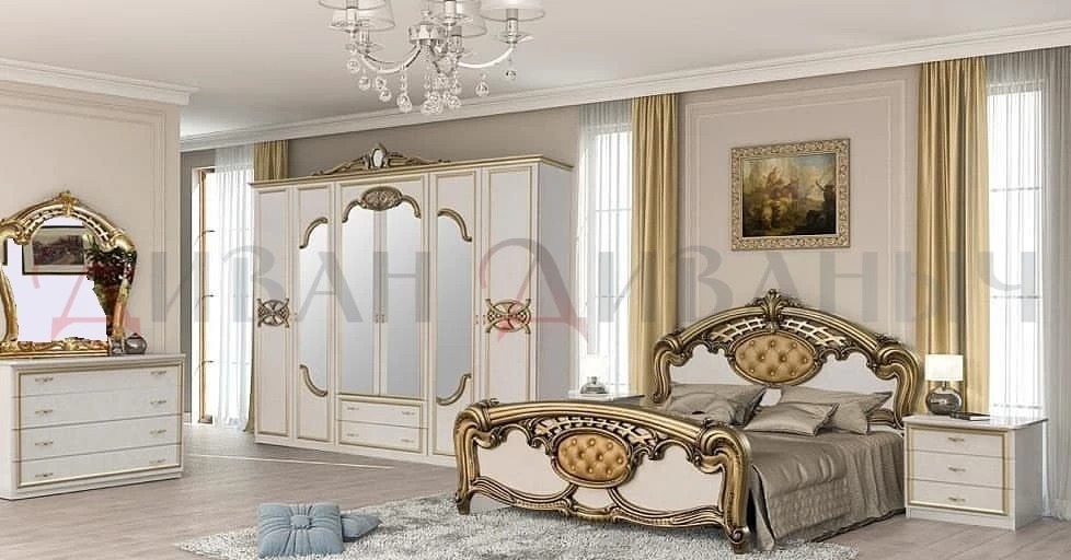 В комплекте: шкаф, кровать, комод, прикроватные тумбы.