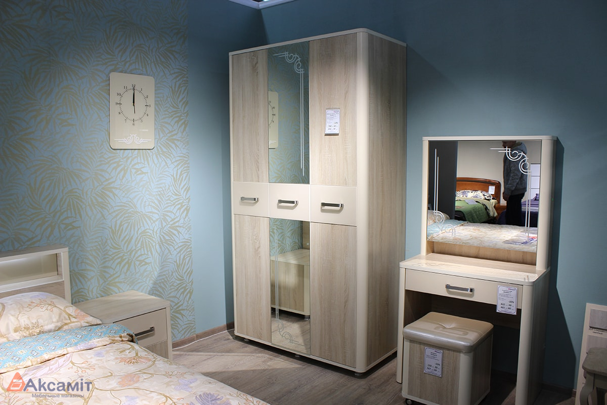Коллекция в сдержанном классическом стиле для спальни. Материал: ЛДСП, профиль МДФ.