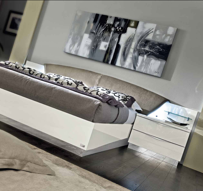 Стильный спальный гарнитур с белыми глянцевыми фасадами. Включает в себя всю необходимую мебель.