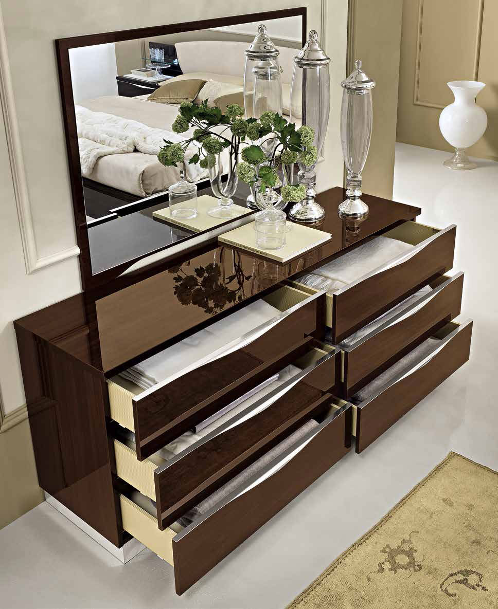 Классический мебельный набор для спальни выполнен из натурального массива дерева. Гарнитур включает в себя большую двуспальную кровать, две прикроватные тумбочки, вместительный шкаф для одежды и комод с настенным зеркалом. Конструкция кровати предусматривает скрытую секцию для хранения подушек, одеял и других вещей. Комод имеет несколько вместительных полок, которые позволяют комфортно разместить белье и полотенца.