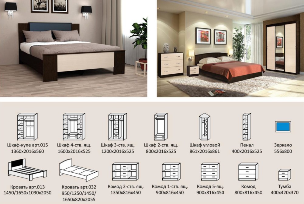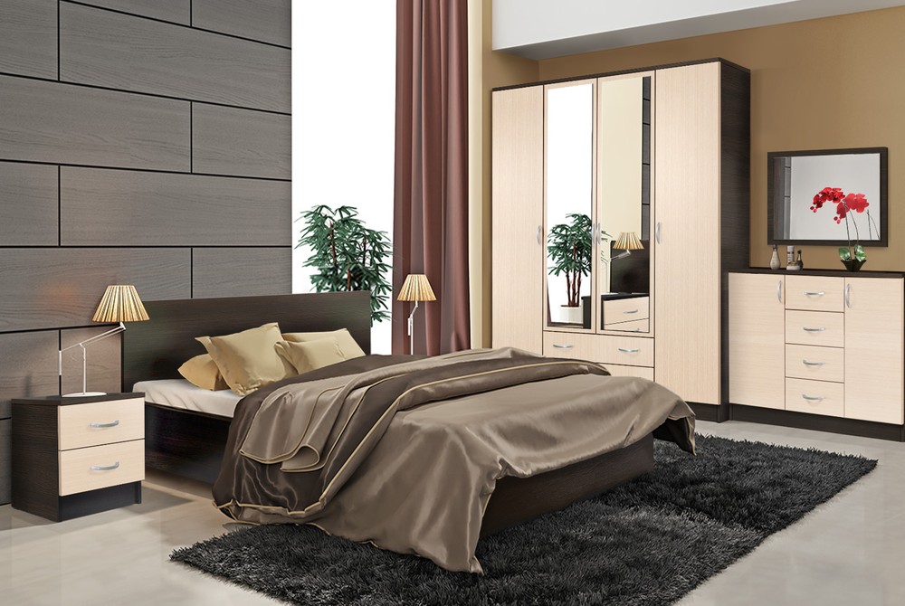 кровать с низким щитком (1,6), Шкаф 4 ств ящ., Комод 2 ств. ящ., 2 тумбы, Зеркало.