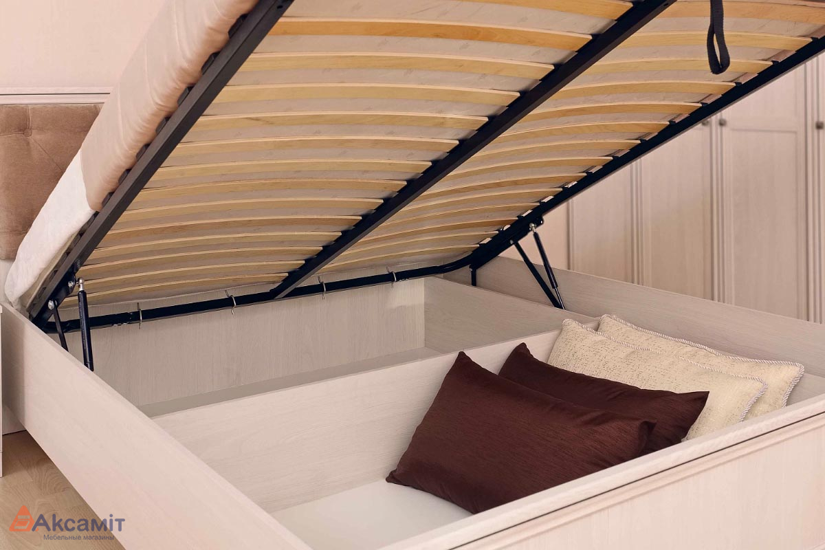 Также отличной частью этой спальни можно назвать красивейшую кровать с мягким изголовьем и практичным подъёмным механизмом.