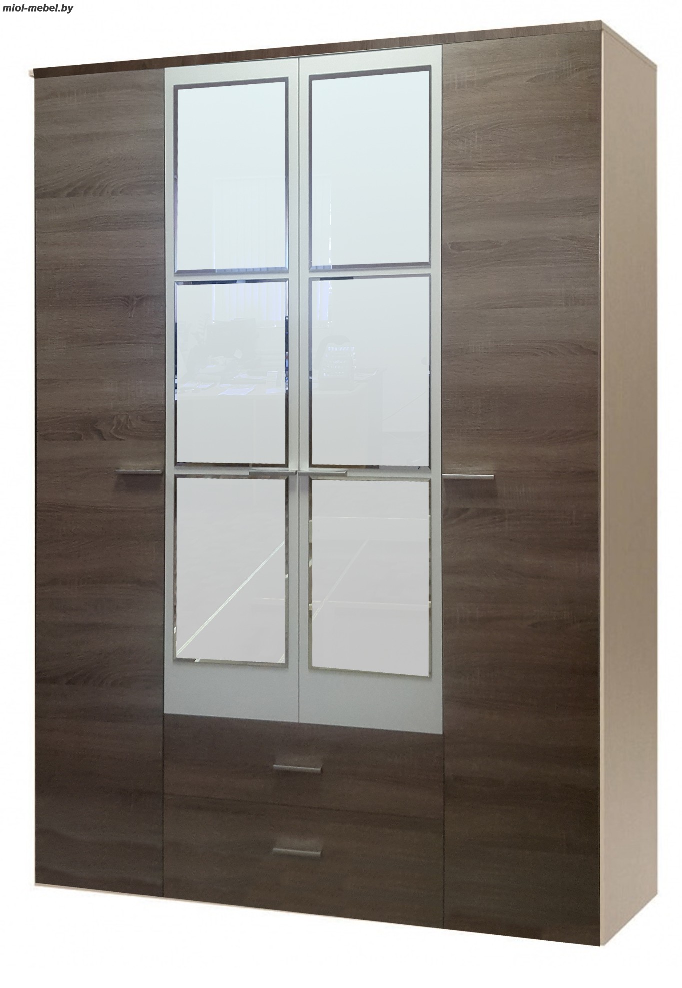 код 88065Белый глянцевый корпус, фасады под дерево. Шкаф с зеркальными вставками.