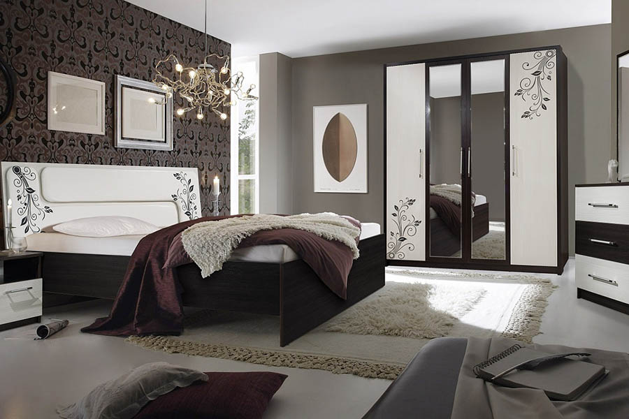 Современный комплект мебели в спальню в двухцветном оформлении.