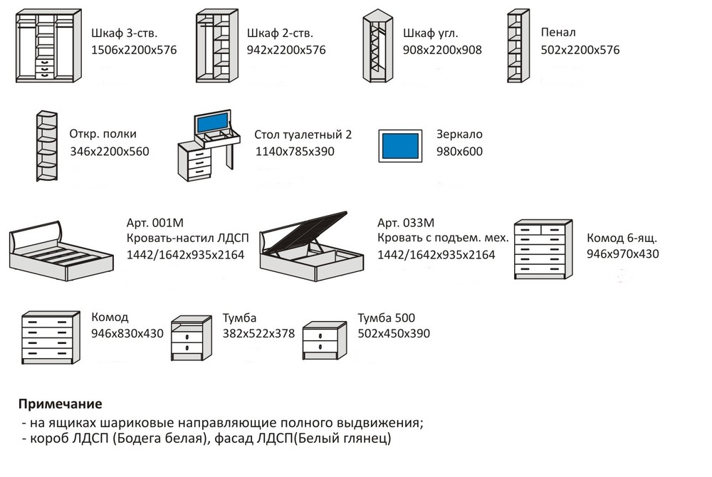 Комплект мебели для спальни линейки Онтарио, изготовленный из ЛДСП.