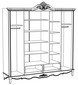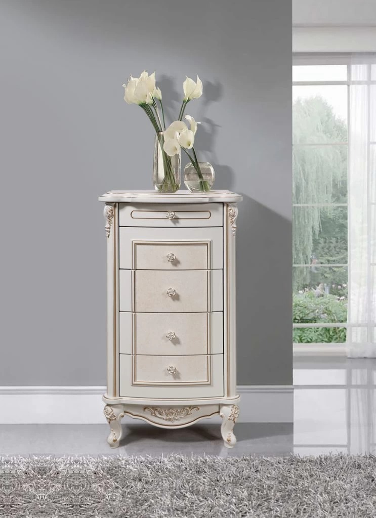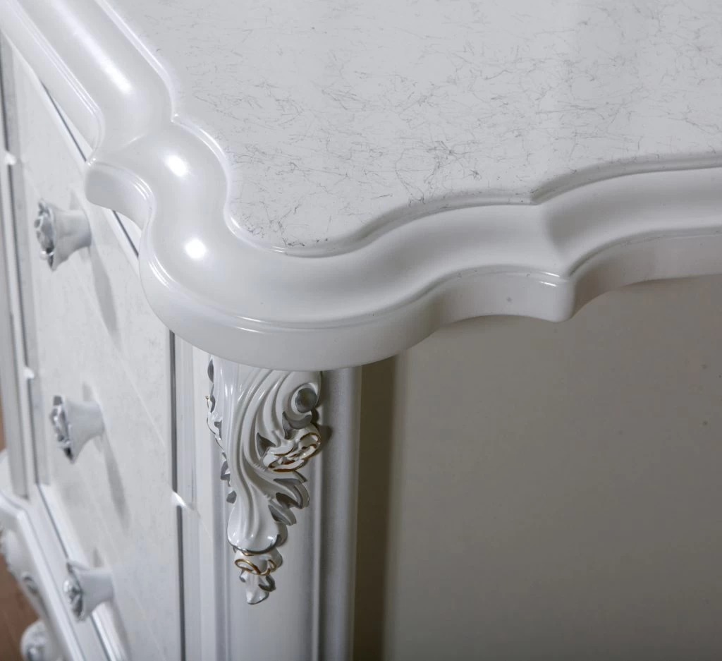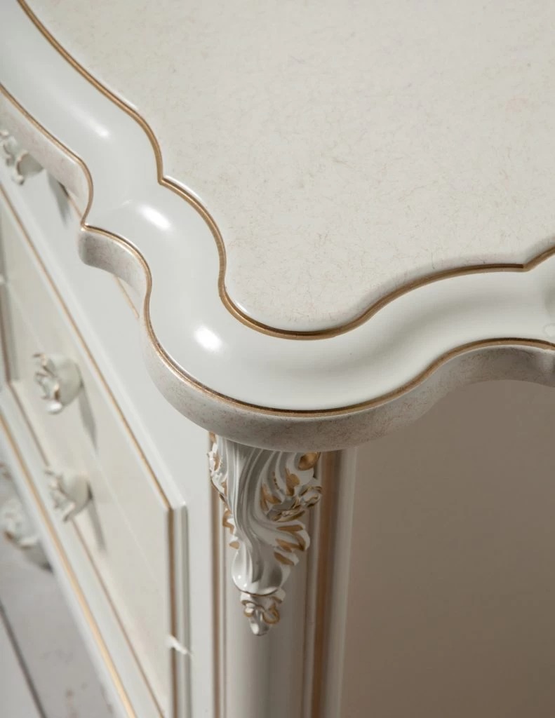 СПАЛЬНЯ “РОЗА 5К” С КОМОДОМ Варианты цветового исполнения набора: белая эмаль c серебряной отделкой, слоновая кость c золотой отделкой. Варианты цвета мягкого элемента: для золотой отделки — бежевый, для серебряной отделки — серый. Предметы коллекции спальни “РОЗА 5К” Шкаф 5-и дверный H2432 х B2404 х T680 Кровать H1536 х B2236 х T2180 (спальное место: 1800 x 2000) Комод H859 х B1117 х T485 Комод высокий H1098 х B610 х T470 Тумба прикроватная H672 х B631 х T455 Зеркало в раме H999 х B859 х Т80 Банкетка H492 х B430 х Т430 Дополнительные элементы под заказ: комод высокий, банкетка.
