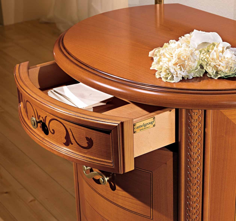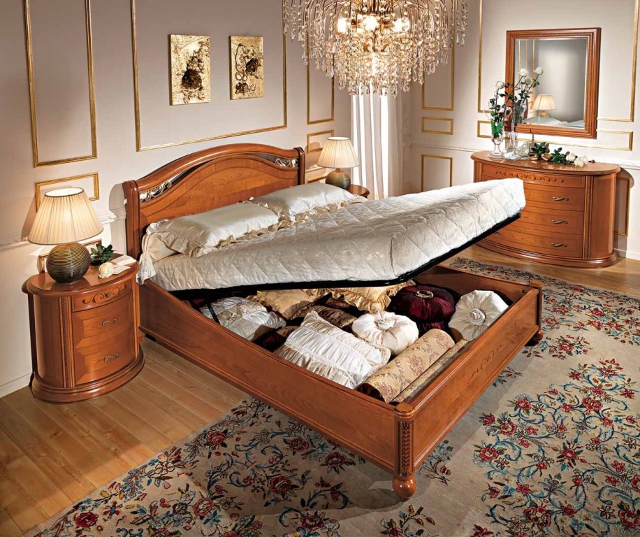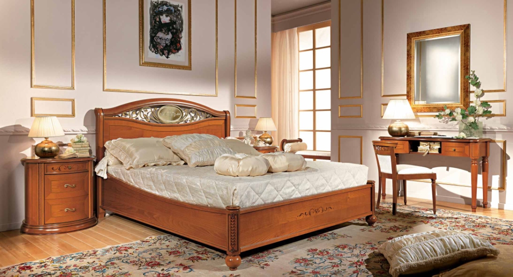 Спальня «Siena» выполнена из массива черешни и украшена различными вставками из лимонного и красного дерева. Головная спинка кровати украшена элегантным узором кованного железа и овальным зеркалом с бронзовым напылением и декором из пыли хрусталя. Ножки кровати исполнены в форме луковицы. Инкрустация из красного и лимонного дерева. Цена указана за кровать + решетку для матраса.