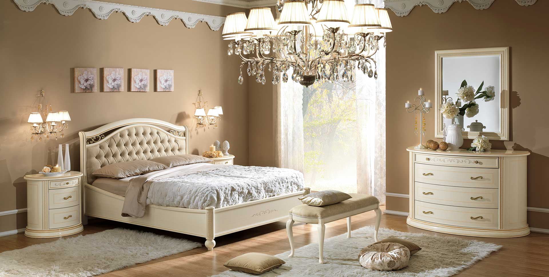 Данная спальня выполнена в классическом стиле и имеет изысканный дизайн. В состав набора входит двуспальная кровать с высоким изголовьем, две прикроватный тумбочки, прикроватная скамья, большой шкаф с зеркалом и вместительный комод. На мебельных фасадах присутствует декоративная резка и фрезерование. Гарнитур окрашен в приятный кремовый цвет с редкими вставками золотого.