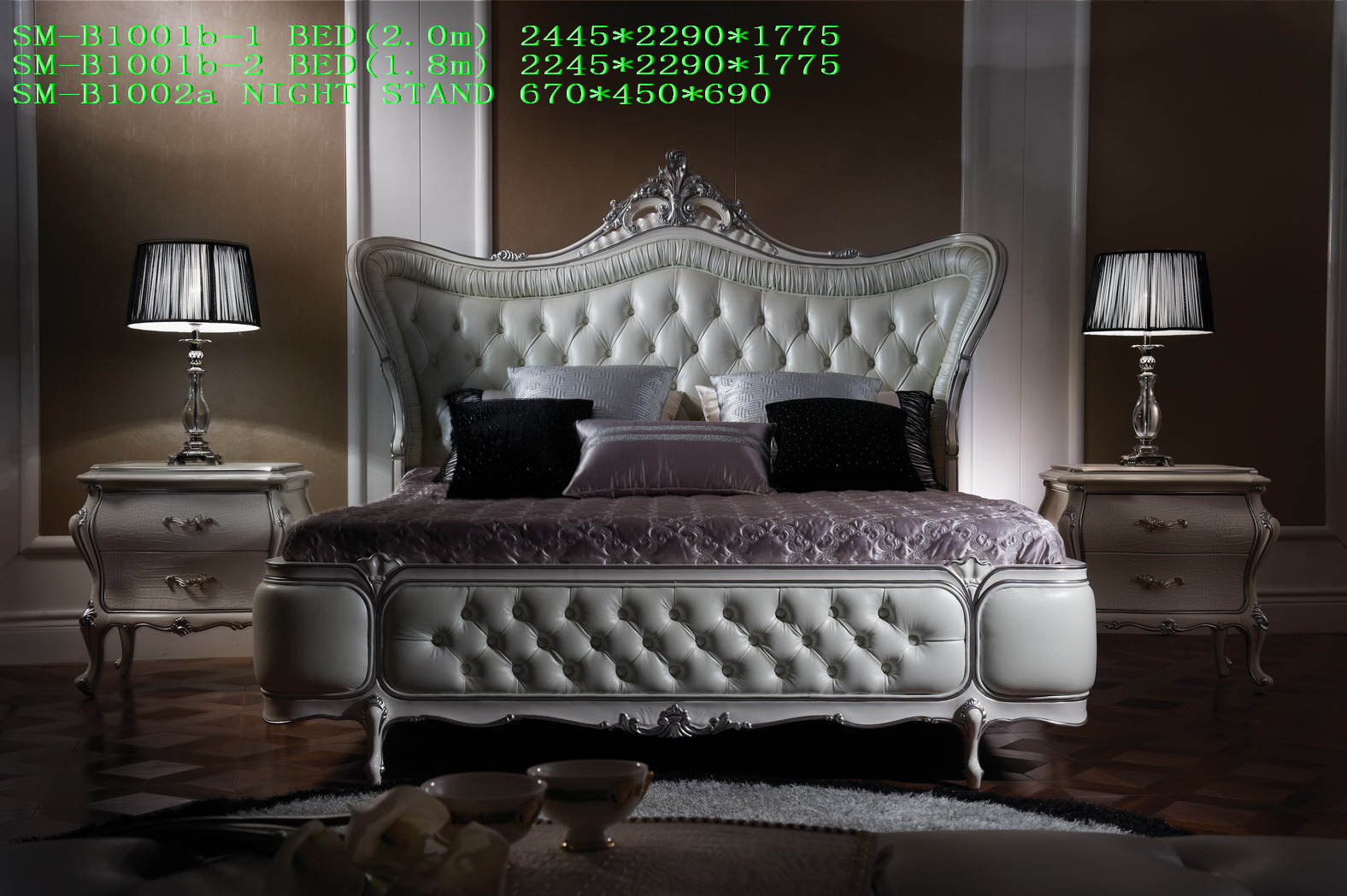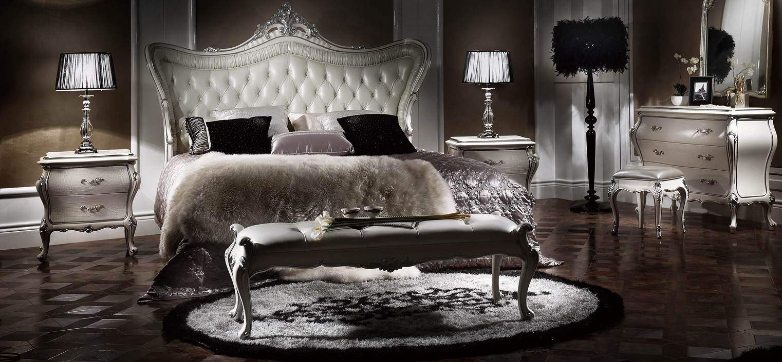 Спальный гарнитур достойный королевской опочивальни. Широкая кровать с высоким изголовьем в кожаной стяжке.
