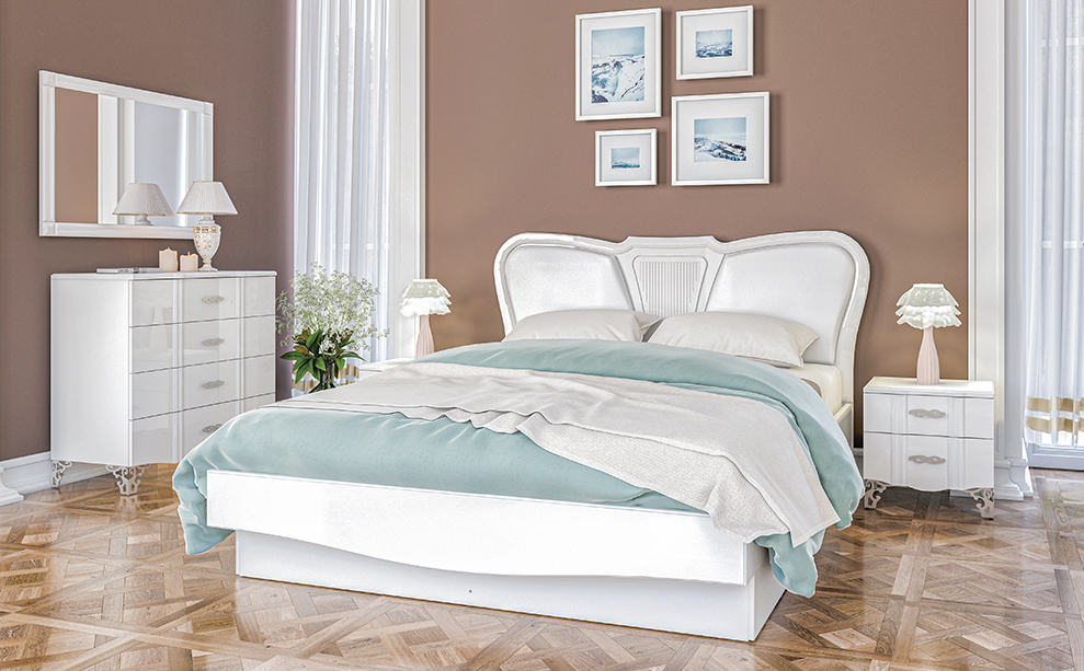 код 151822Спальня «София» - это великолепие белого глянца в сочетании с серебристыми деталями. Материал: МДФ покрытый плёнкой, ЛДСП.