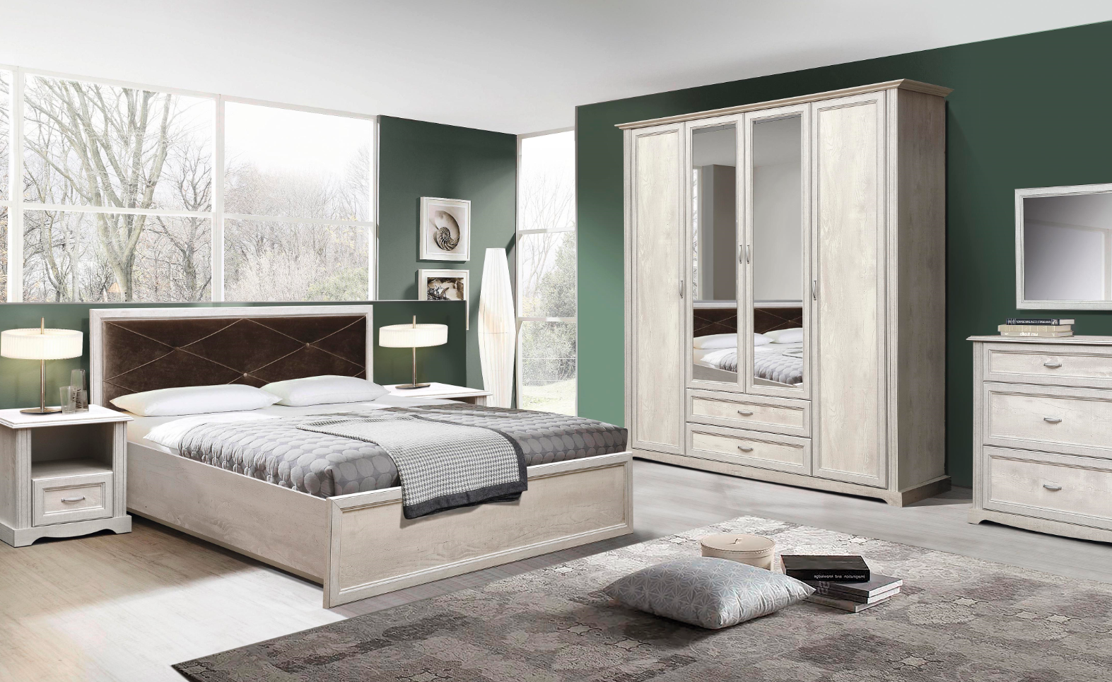 Цена указана на комплектацию спальни, которая показана на первой картинке (шкаф 4-х ств., кровать (спальное место 1,6*2), комод, две тумбы прикроватные, зеркало).