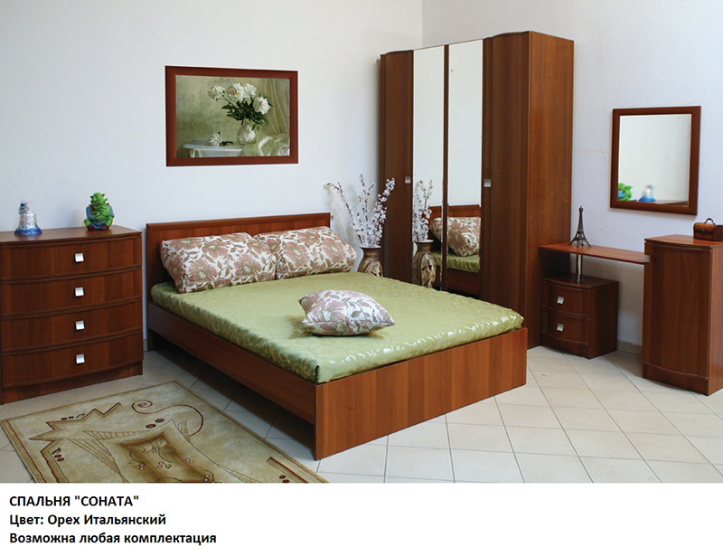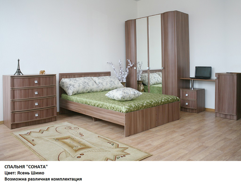 Модульная спальня «Соната» изготовлена из прочного материала с использованием качественной фурнитуры. Комплекция включает в свой состав двуспальную кровать, вместительный шкаф, комод с выдвижными ящиками и туалетный столик с зеркалом. На выбор предлагается несколько вариантов цветового оформления модульной спальни.