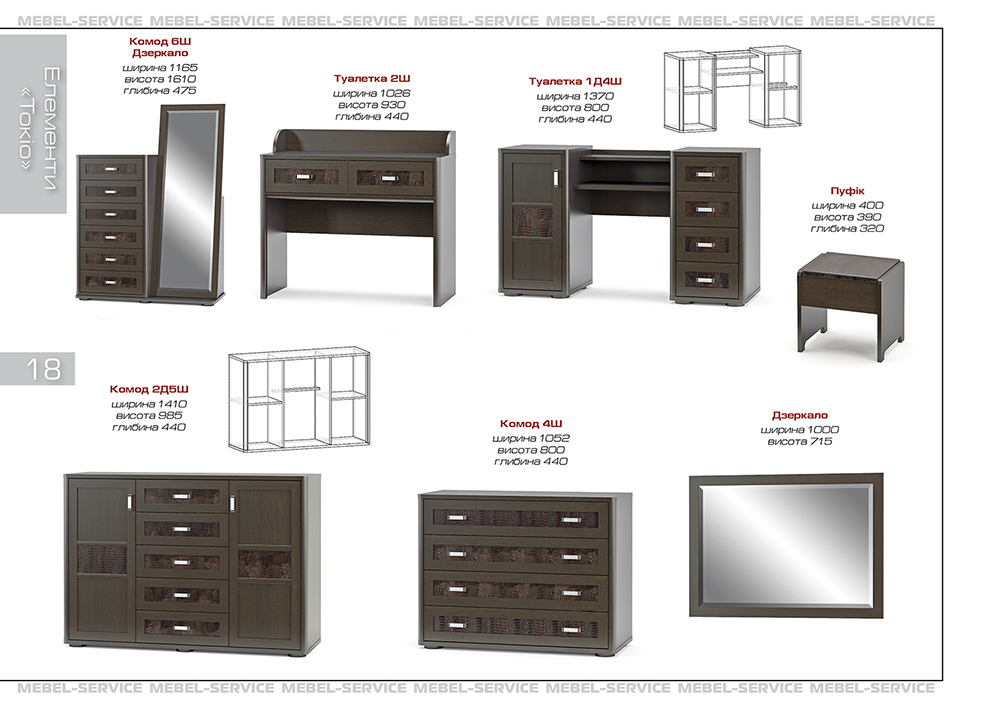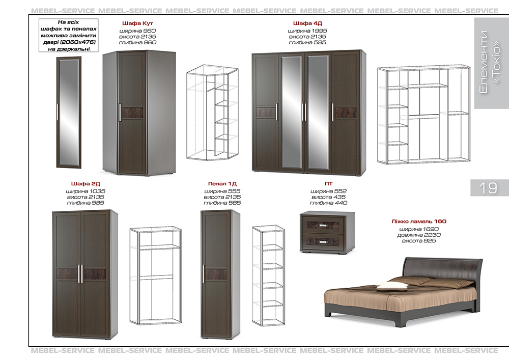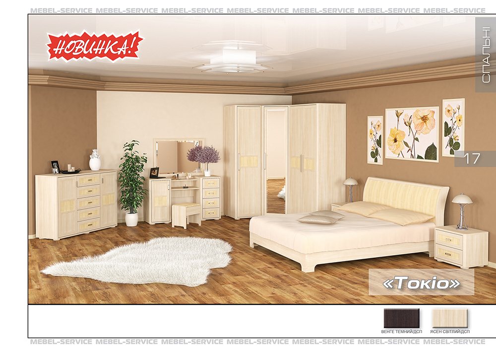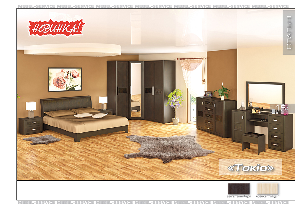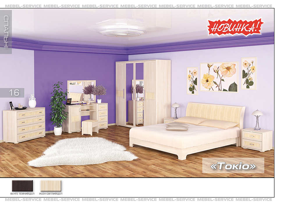 Спальня «Токио» может быть выполнена в двух цветовых вариациях: темном венге и светлом ясень. Фасад украшен изящными вставками из экокожи. Гарнитур можно приобрести по комплектующим.