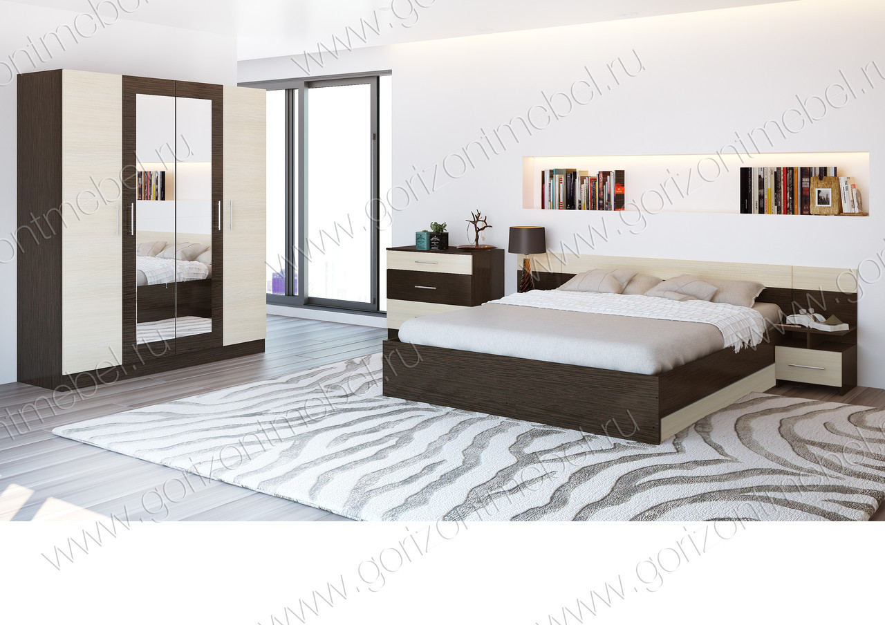 Спальня Уют - превосходный набор мебели в теплых оттенках для обустройства комфортной и практичной спальни. Натуральные контрастные цвета, использованные в представленной коллекции, создают гармоничную и универсальную композицию, которая сделает ваш дом действительно уютным. Набор включает в себя: распашной четырехстворчатый шкаф с зеркалами, комод, двуспальная кровать и две прикроватные тумбы с надстройками. Широкая двуспальная кровать с настилами, образующими надежное и гигиеничное основание, позволяющее свободно циркулировать воздуху, в сочетании с двумя оригинальными прикроватными тумбами образуют цельную композицию, которая выглядит очень эффектно и создает законченный и солидный вид меблировке спальни. Широкий вместительный шкаф и комод безупречно организуют пространство комнаты и позволят найти место для любой Вашей вещи.