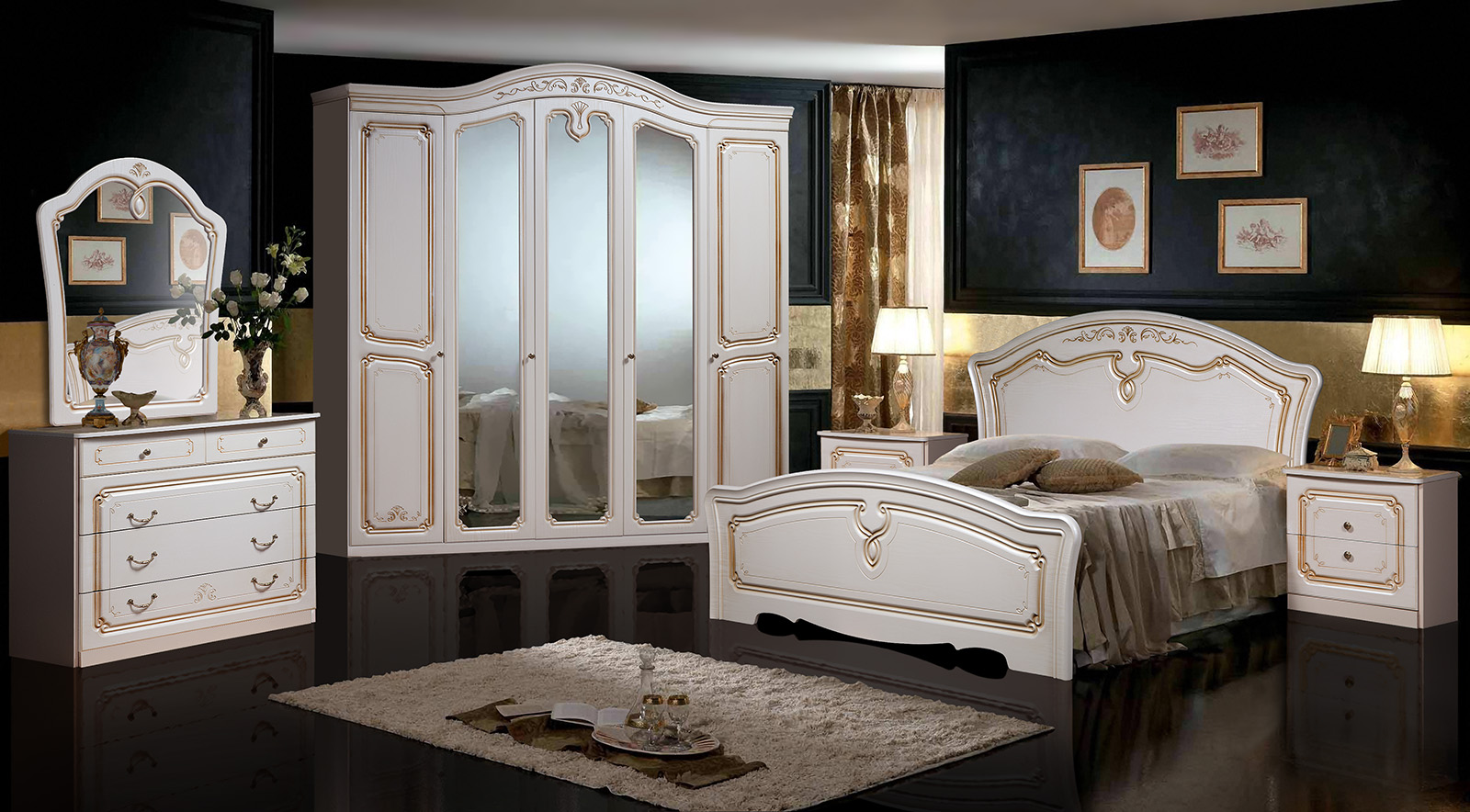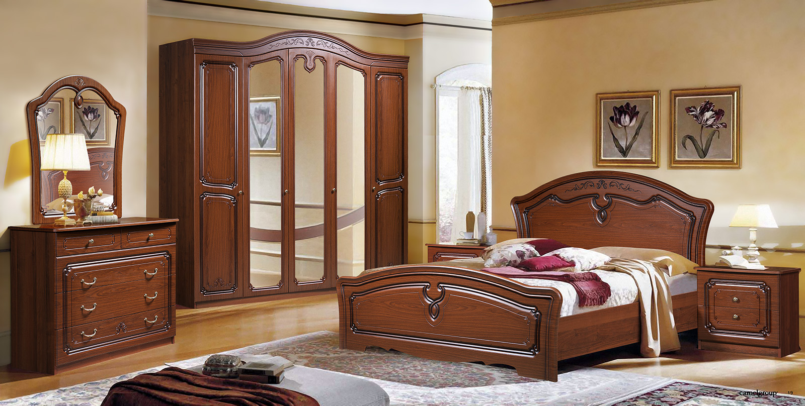 Полный комплект: кровать, прикроватные тумбы, шкаф, комод.