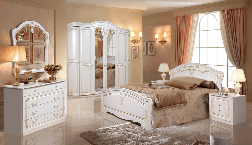 Классическая коллекция мебели в белом полуглянце для спальни. Материал: МДФ покрытый плёнкой, ЛДСП.