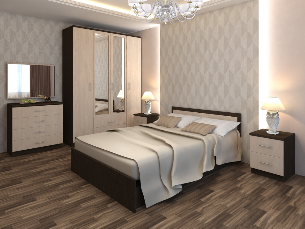 Мебельный набор предназначен для обустройства уютной и современной спальни. Широкая двуспальная кровать позволяет получать полноценный ночной отдых и восстановление. Для хранения одежды предусмотрен большой зеркальный шкаф и вместительный комод с выдвижными ящиками. Для удобства возле кровати размещаются прикроватные тумбочки.
