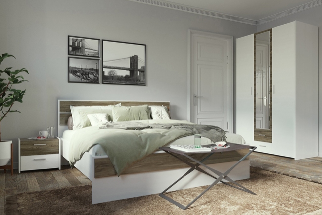 Современный спальный гарнитур из ЛДСП светлого цвета с уютными деревянными вставками.Состоит из кровати шкафа и двух прикроватных тумбочек.