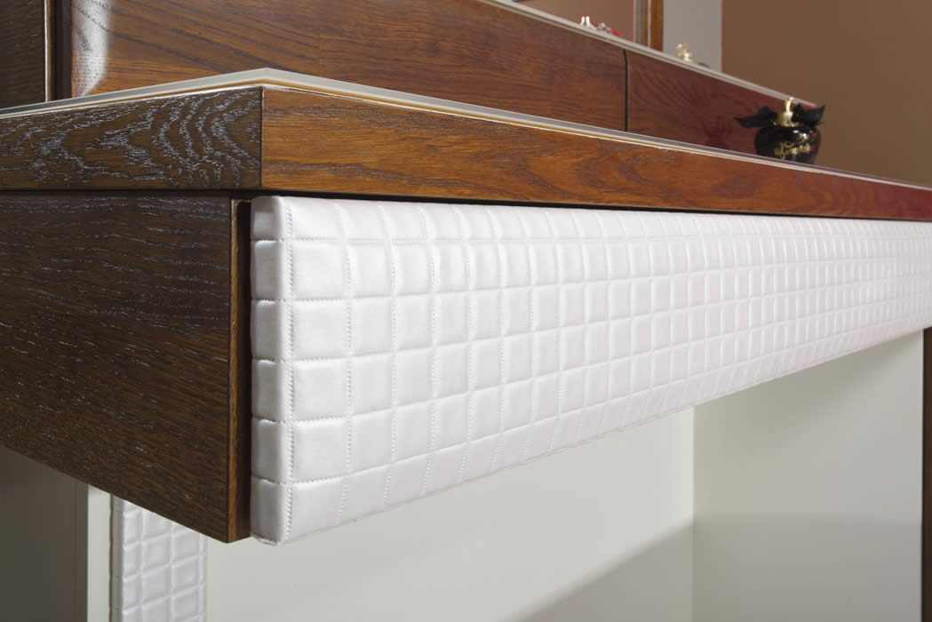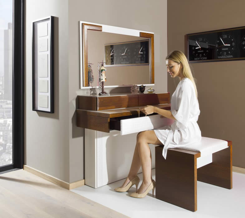 В коллекции присутствуют, среди прочего, стол, банкетка с удобным сиденьем, просторная двуспальная кровать с тумбочками по обеих сторонах, комод, туалетный столик с зеркалом и удобный в использовании шкаф в нескольких вариантах исполения. Отделка экологически чистыми водными лаками, за исключением поверхностей, требующих использования других видов покрытия.