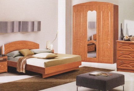 Спальня с оригинальным рисунком резьбы на дверях тумбы и шкафа.