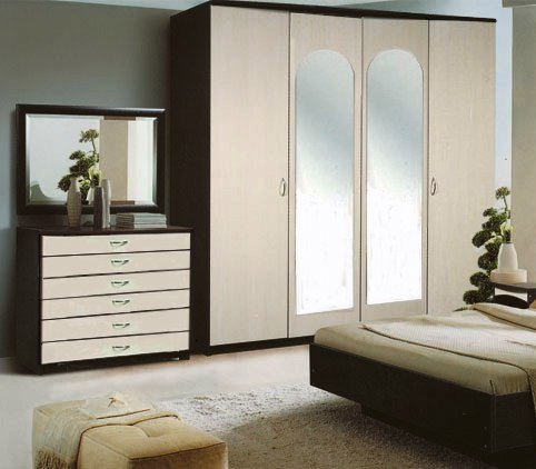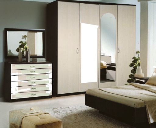 Набор мебели для спальни в комбинации двух светлых оттенков.