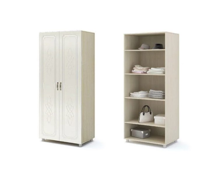 Комплектация: кровать двуспальная, тумба, шкаф двухстворчатый. Материал: ЛДСП.