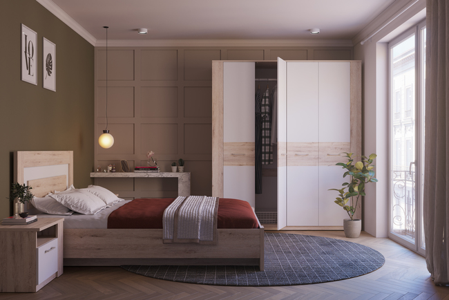 Мебель включает: 1 шкаф распашной, 1 комод, 1 кровать с основанием (матрац не входит в комплект), 2 прикроватных тумбы.