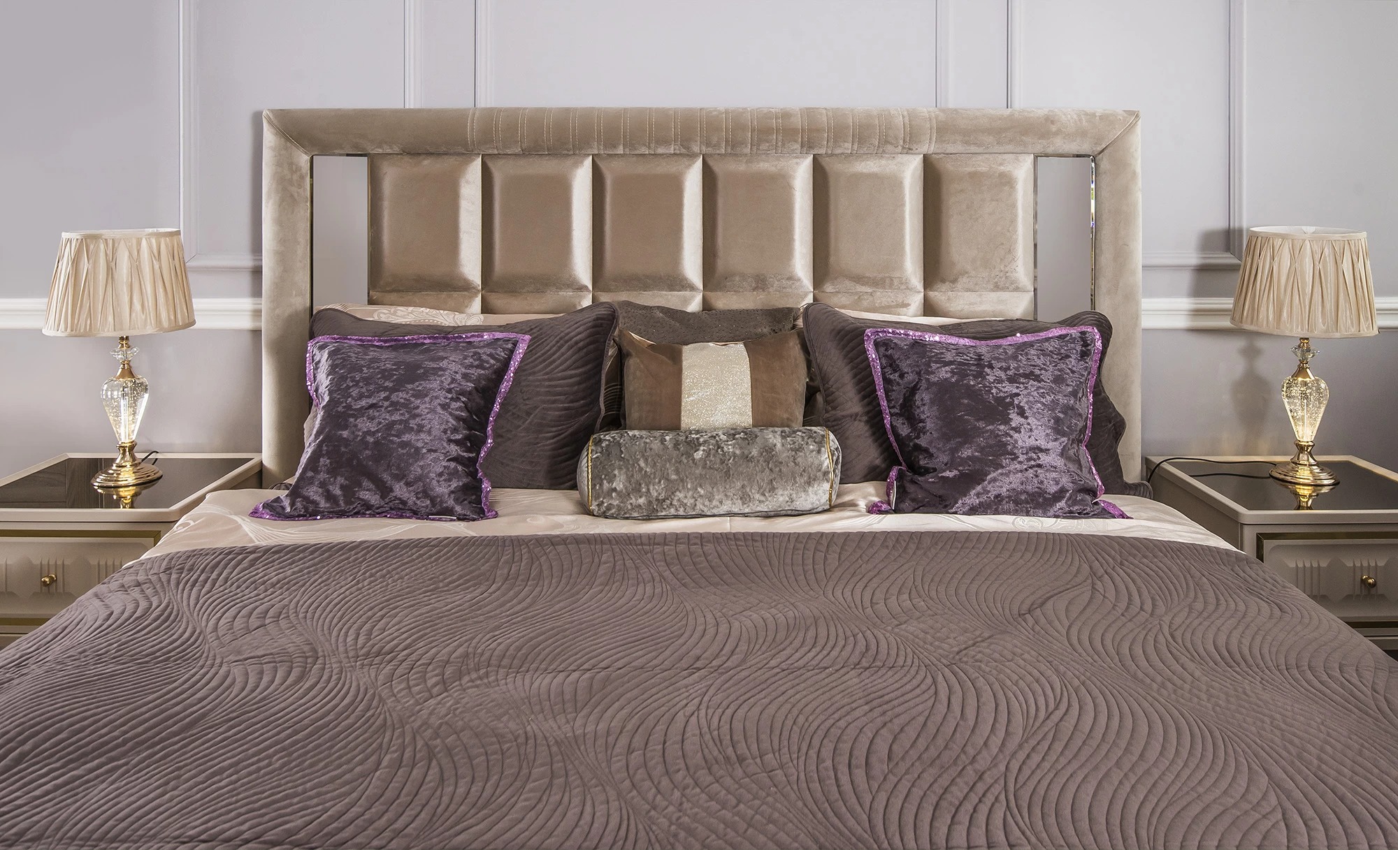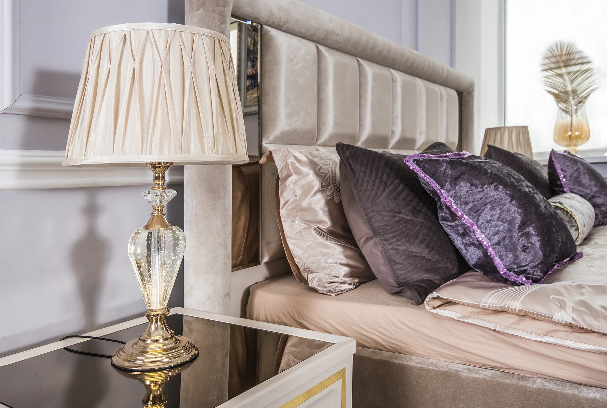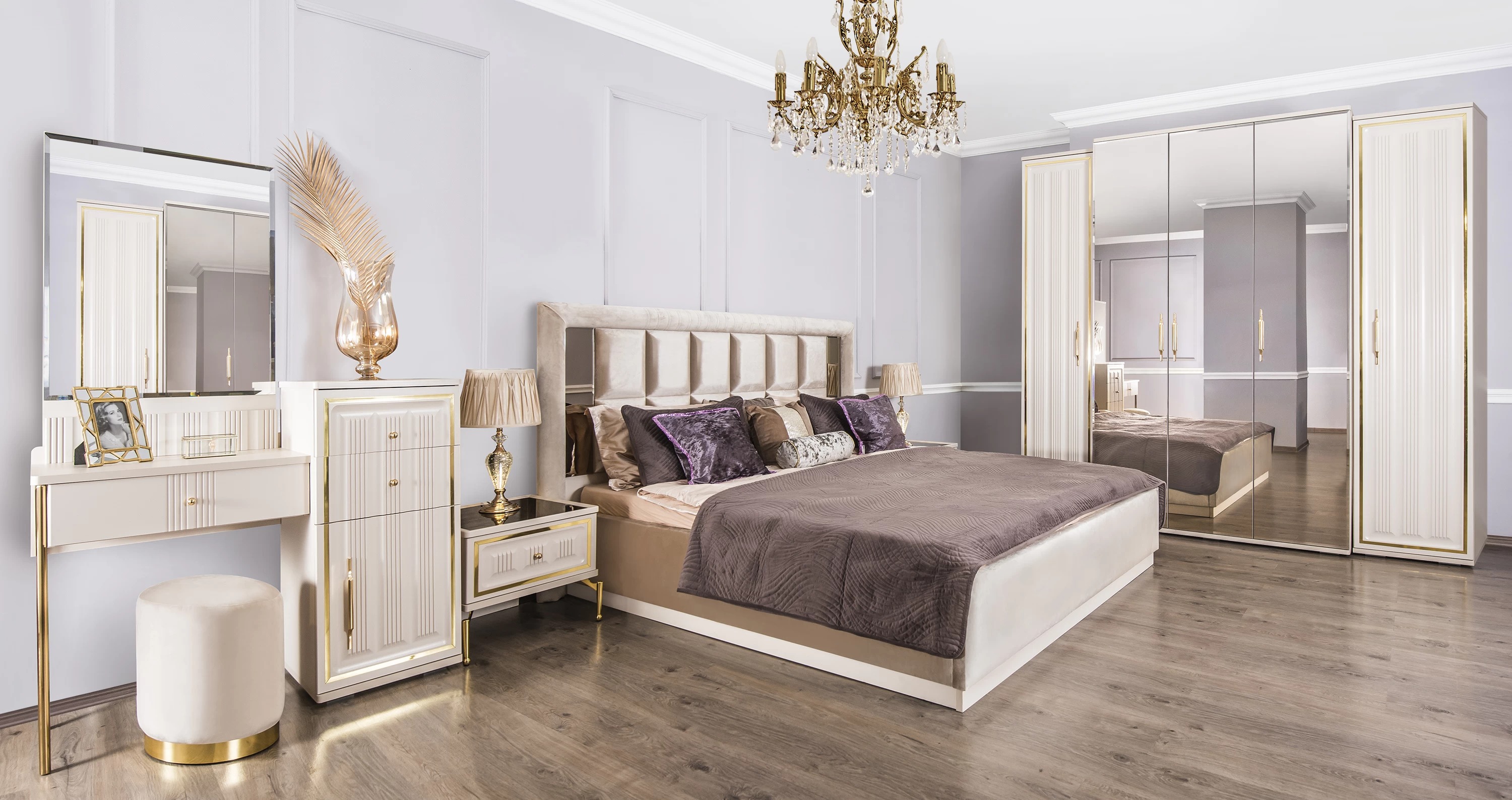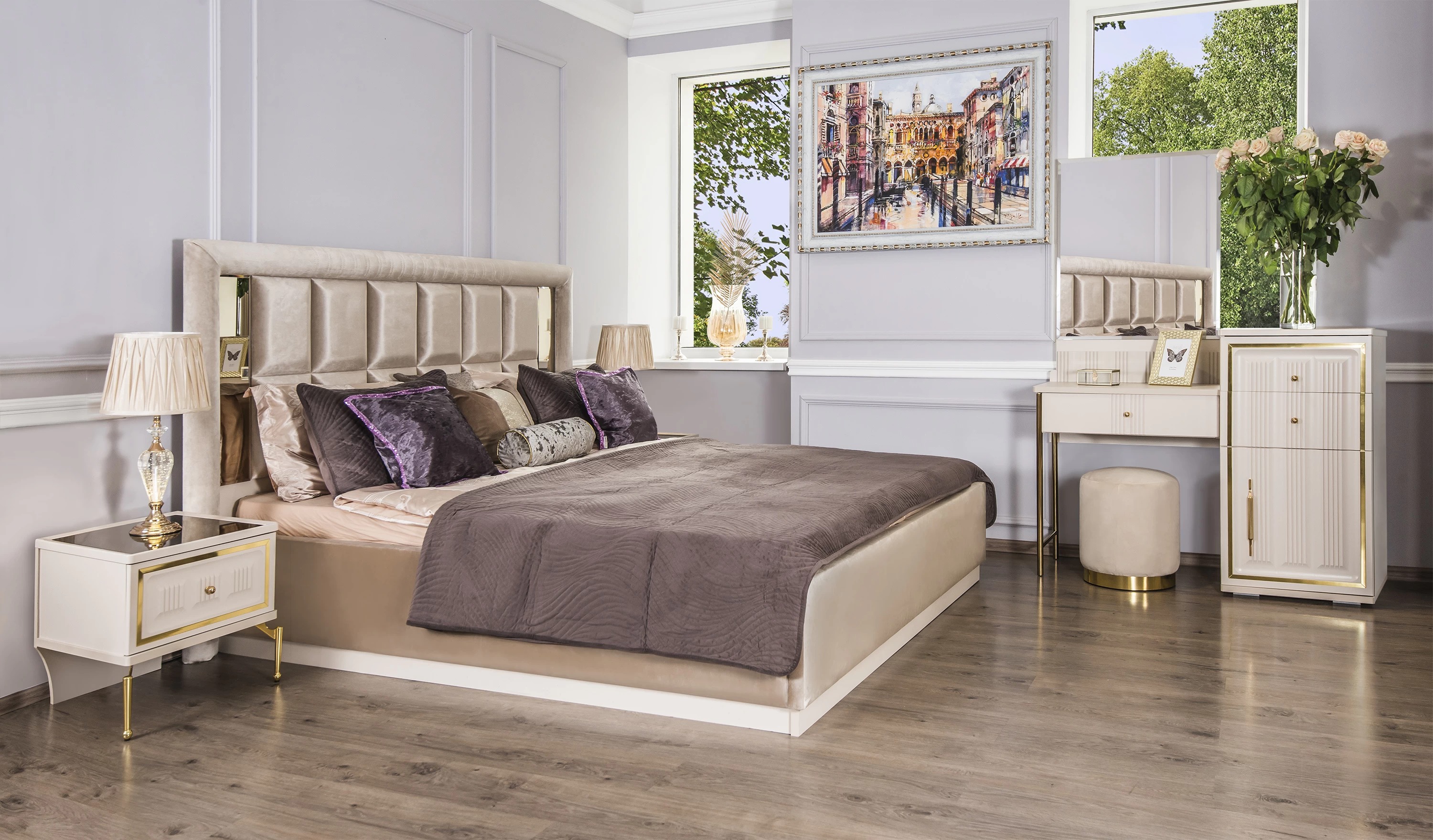 Мебель для спальни Замира имеет множество преимуществ — от безупречного внешнего вида до качества материалов и срока службы. Предметы этой линии выполнены в стиле неоклассики и наделены максимальной функциональностью. Благодаря этому мебель идеально вписывается в соответствующий интерьер. Утонченные элементы, роскошная обивка, витиеватые накладки доставят эстетическое наслаждение своим владельцам. Белый цвет «Lara» мебели позволяет визуально увеличить пространство спальни, подчеркнуть важные детали, добавив в пространство легкости и света. Компания-производитель «ЭРА» доставит товар в любой уголок страны, чтобы создать там царство роскоши и элегантности. Цвет - беж Фасады –крашенные фасады из МДФ с фрезеровкой Корпус – ЛДСП все зеркала с бронзовой амальгамой, придает зеркалу бронзовый и очень модный оттенок На изголовье с зеркальными вставками и изножье находится мягкое основание Фурнитура – производители фирм BOYARD, HAFELE, SALICE все двери шкафов и ящики оснащений доводчиками. Шкаф 5-х ств. - Ш 2275*Г 580*В 2245 Кровать (180х200) - Ш 2105*Г 2060*В 1208 Тумбочка (2 шт.) - Ш 535*Г 495*В 455 Туалетный столик . - Ш 1200*Г 500*В 980 Зеркало - Ш 650*В 900 Пуф для туалетного столика Мебель для спальни ЗАМИРА имеет множество преимуществ — от безупречного внешнего вида до качества материалов и срока службы. Предметы этой линии выполнены в стиле неоклассики и наделены максимальной функциональностью. Благодаря этому мебель идеально вписывается в соответствующий интерьер. Утонченные элементы, роскошная обивка, витиеватые накладки доставят эстетическое наслаждение своим владельцам. Белый цвет «Lara» мебели позволяет визуально увеличить пространство спальни, подчеркнуть важные детали, добавив в пространство легкости и света. Компания-производитель «ЭРА» доставит товар в любой уголок страны, чтобы создать там царство роскоши и элегантности.