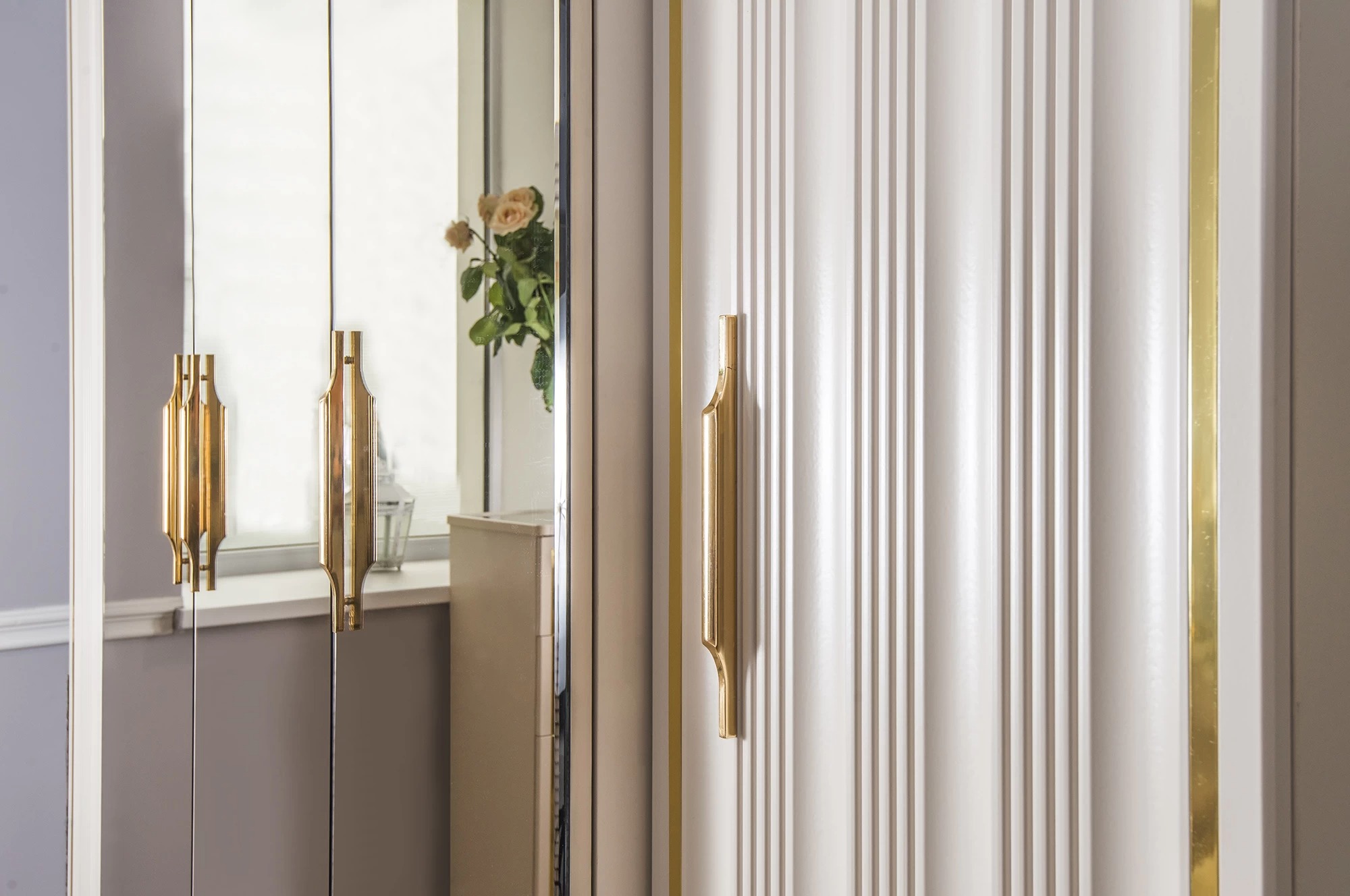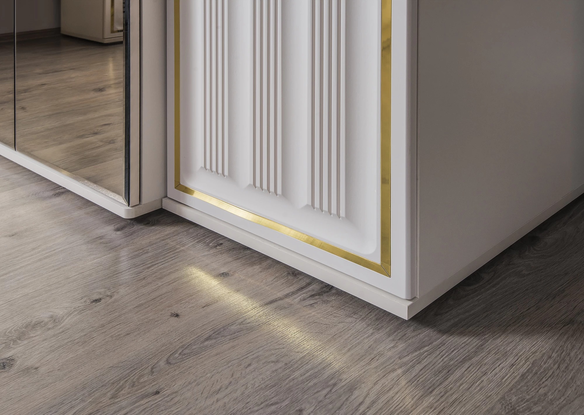 Оригинальная коллекция с фурнитурой золотого цвета и вертикальной фрезеровкой. Материал: МДФ, ЛДСП.