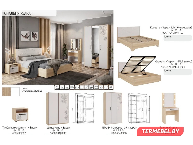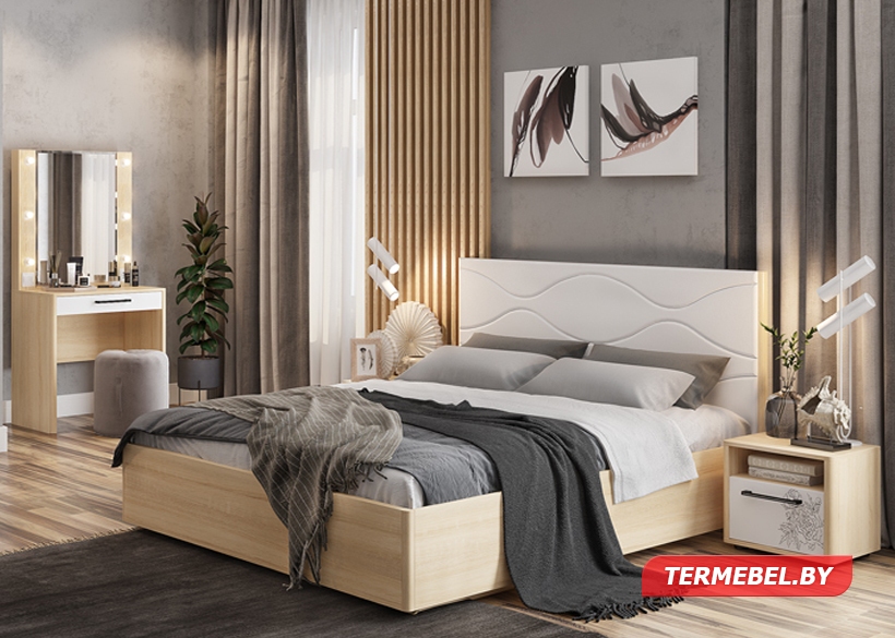 Стоимость указана за изделие в минимальной комплектации - кровать, трюмо, тумба прикроватная.