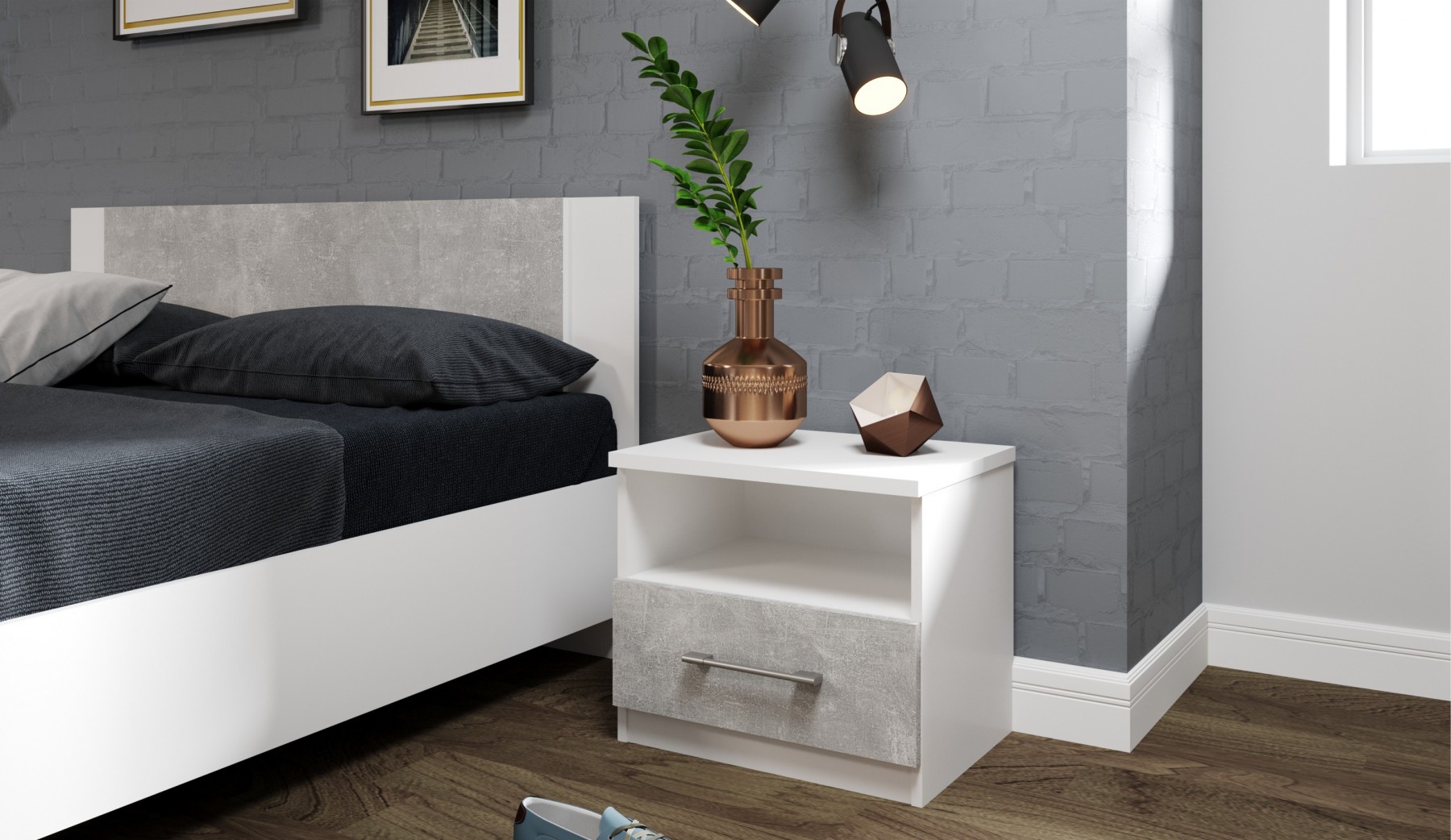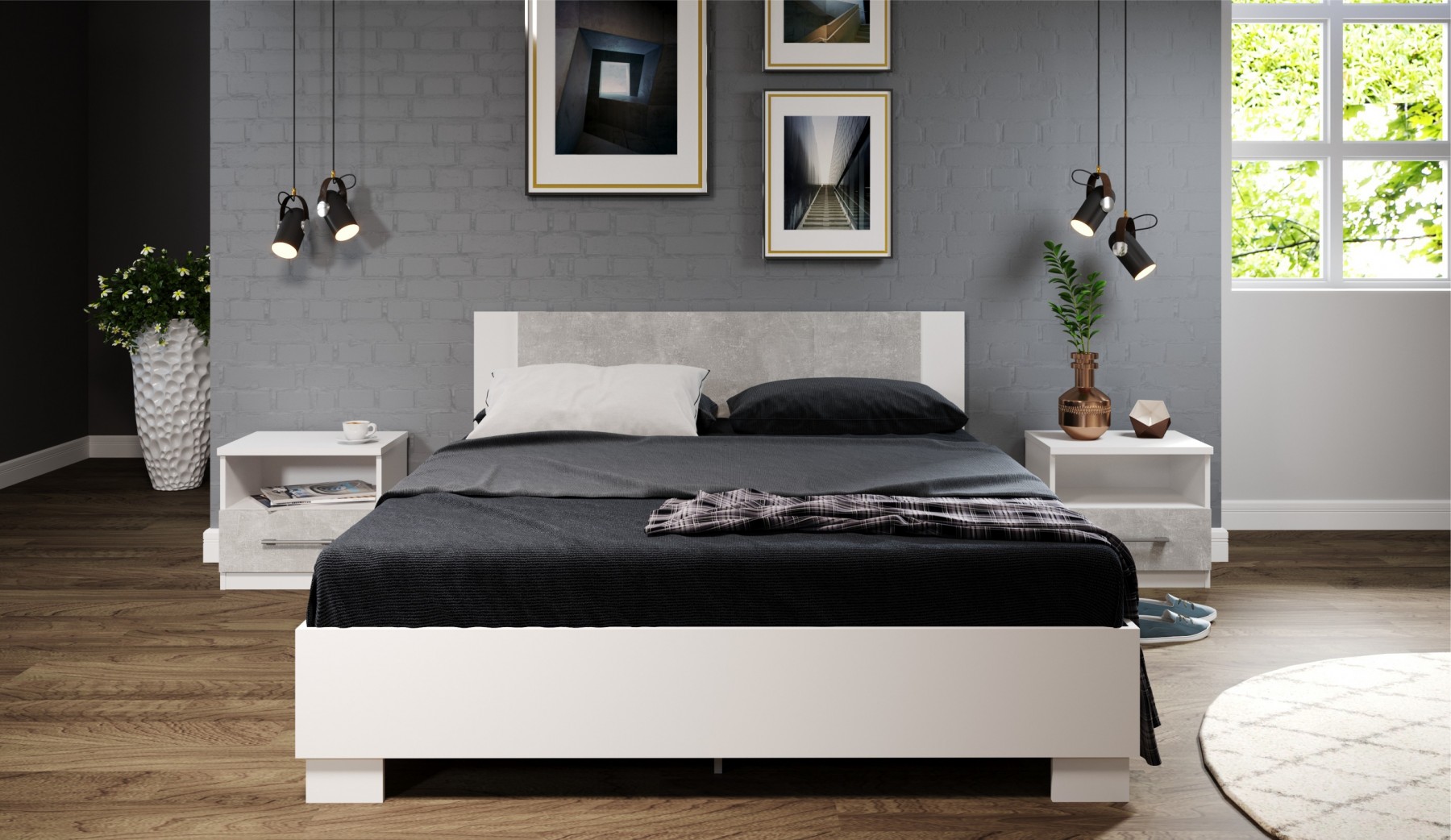 Современный комплект мебели в спальню в двухцветном оформлении.