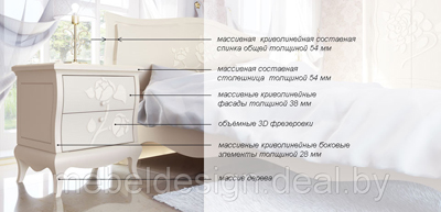Белый спальный гарнитур «Астория» изготовлен из высококачественных материалов европейского производства. Умелое сочетание классики с современными 3-D объемными рисунками – отличительная особенность представленной модели.