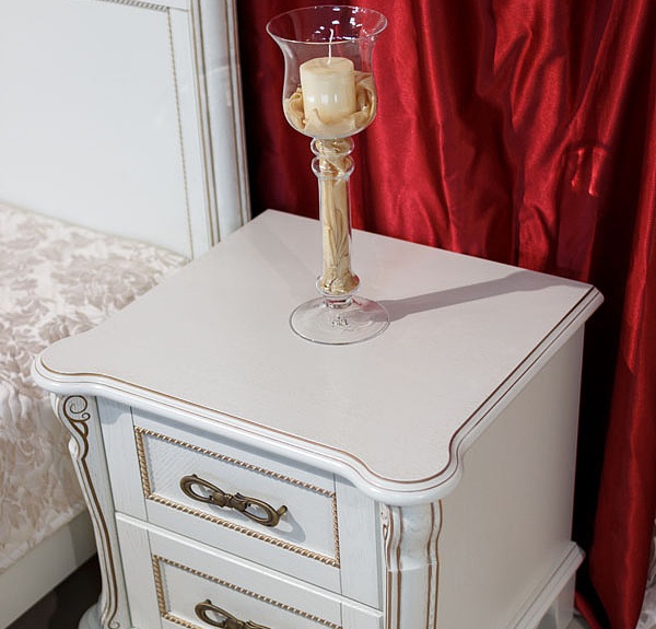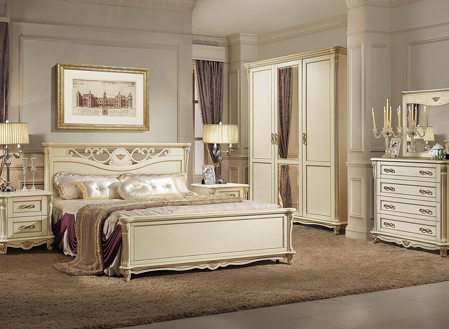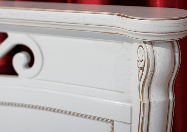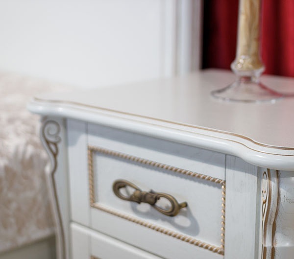 Набор мебели для спальной комнаты, выполненный в светлом оттенке. Изголовье и изножье кровати украшены фрезерованным узором, в том числе сквозным. Ажурная резьба на рамках и фасадах.