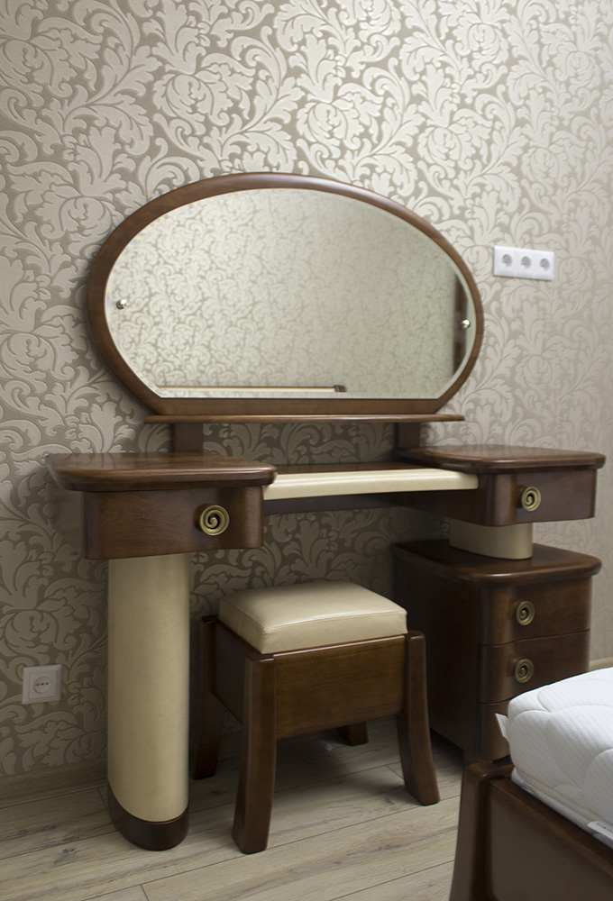 Спальный гарнитур «Катерина 5» выполнен из массива дерева. Изголовье кровати имеет мягкую вставку с ромбовидной стяжкой. В дизайне предметов мебели преобладают плавные линии.