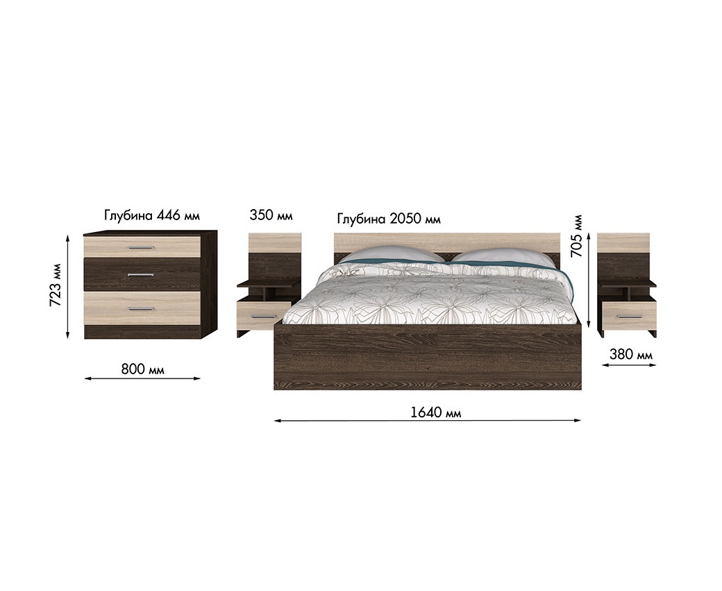 В комплекте: шкаф. кровать с мягким изголовьем, комод, две тумбочки