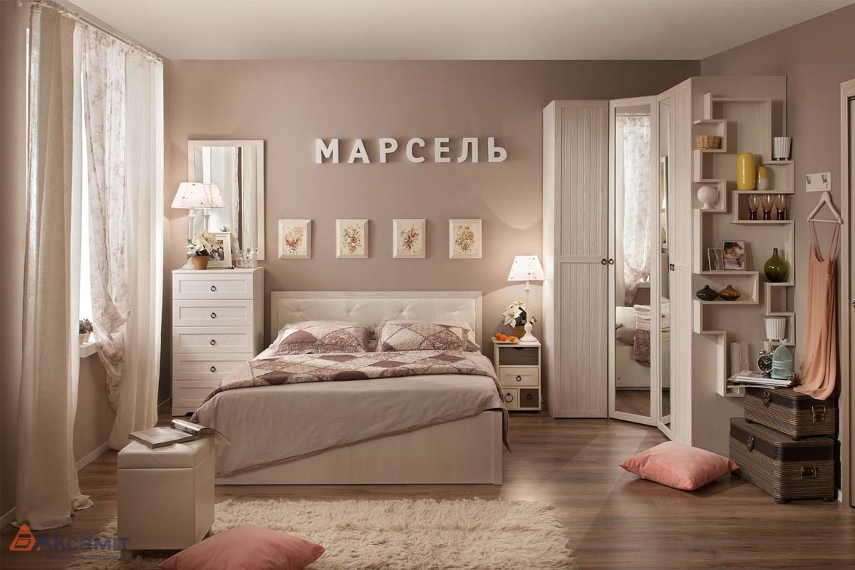 В состав спальни входят кровати, тумба, комоды, шкафы, пенал, тумба под ТВ.