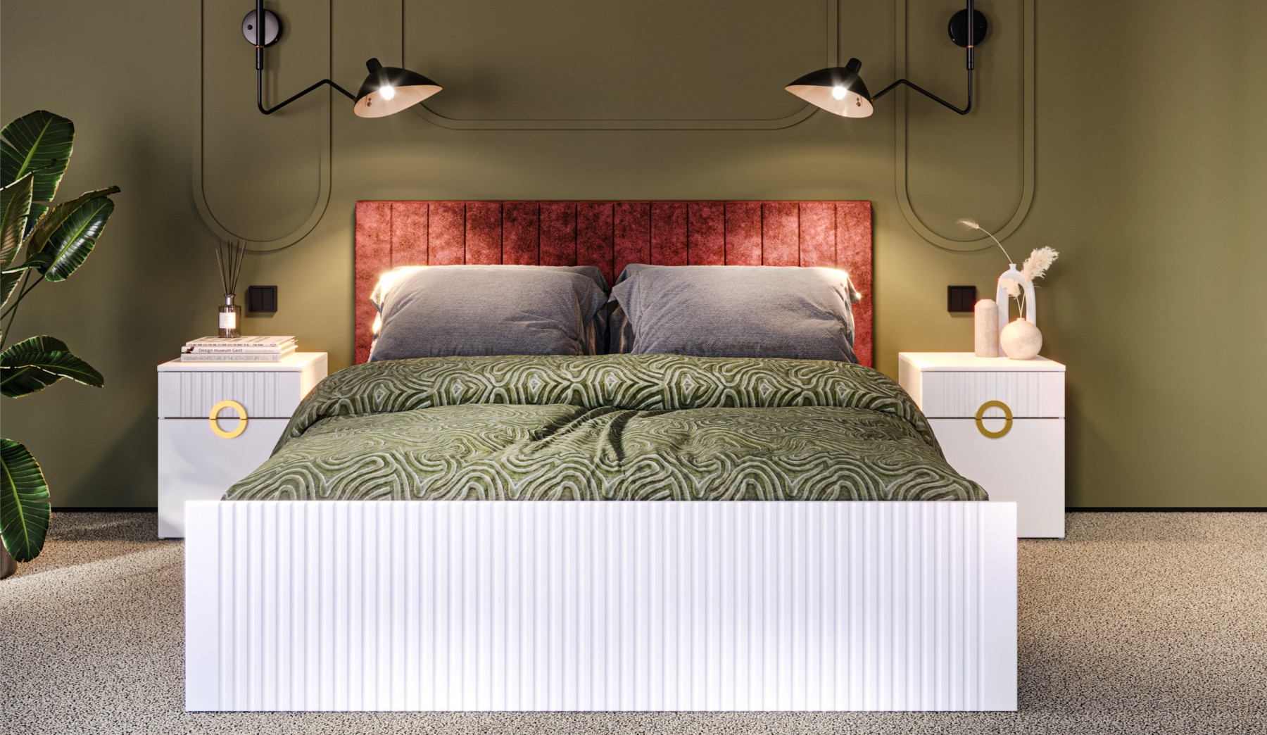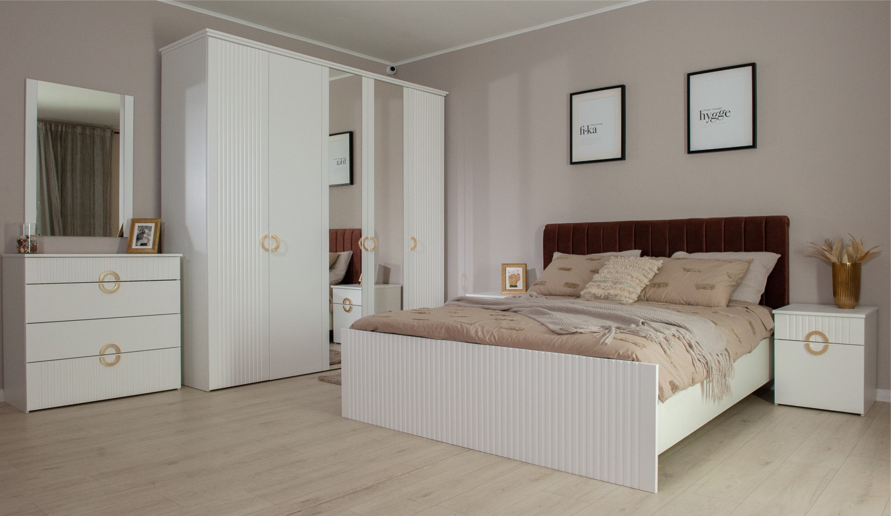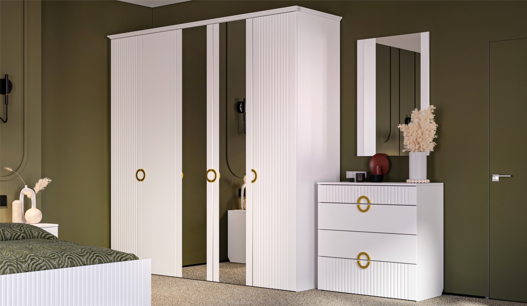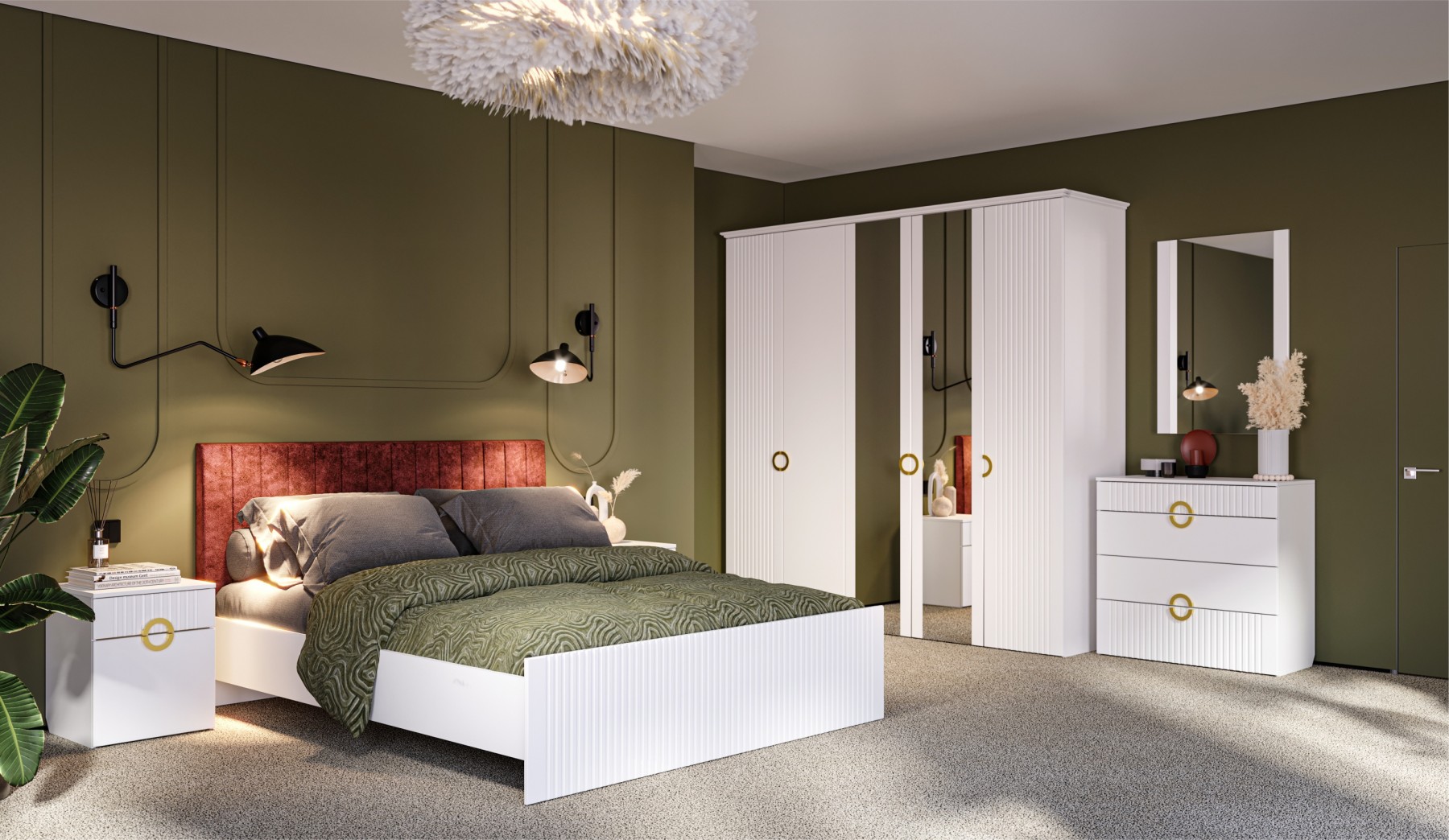 Современная белоснежная спальня с трехдверным шкафом.