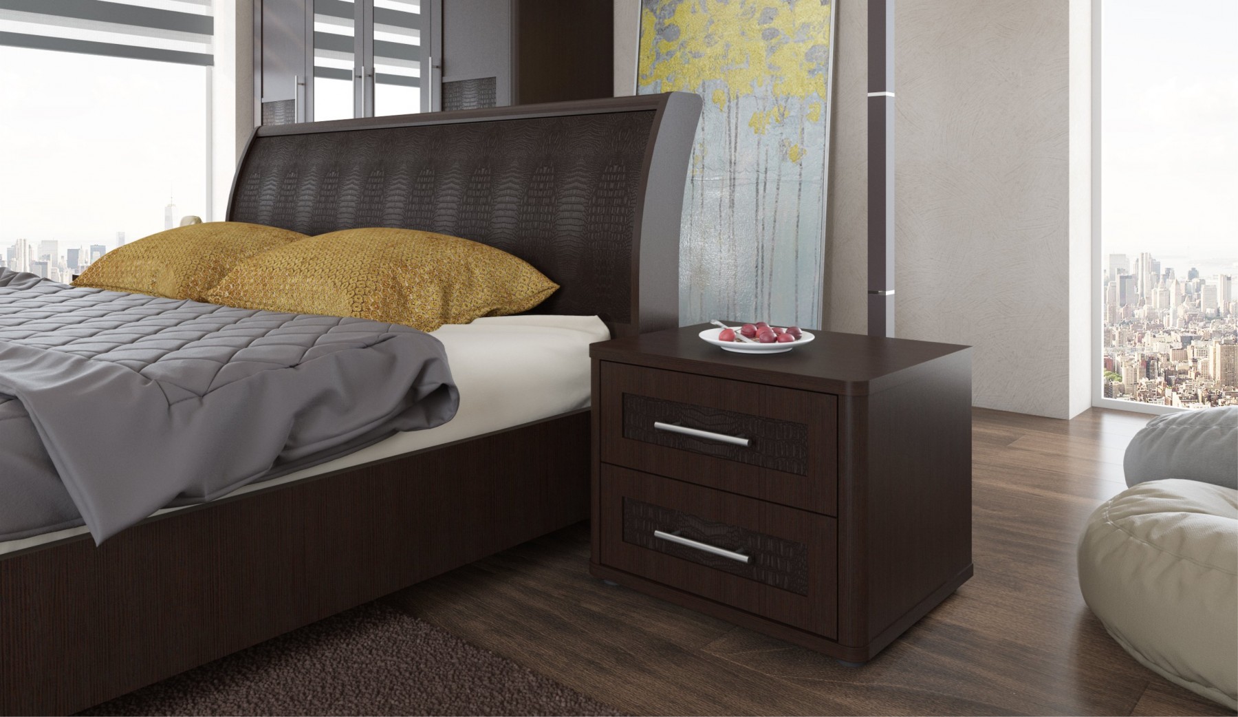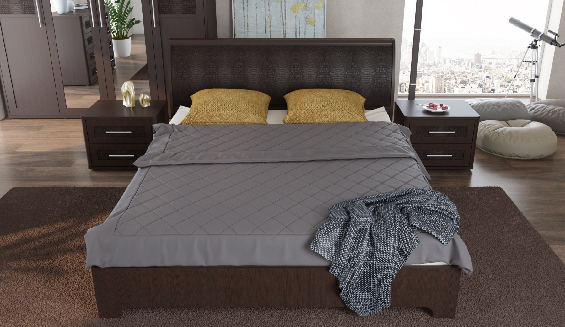 В комплекте: кровать двуспальная, шкаф распашной 2ств., тумба подвесная 2 шт., пенал открытый.