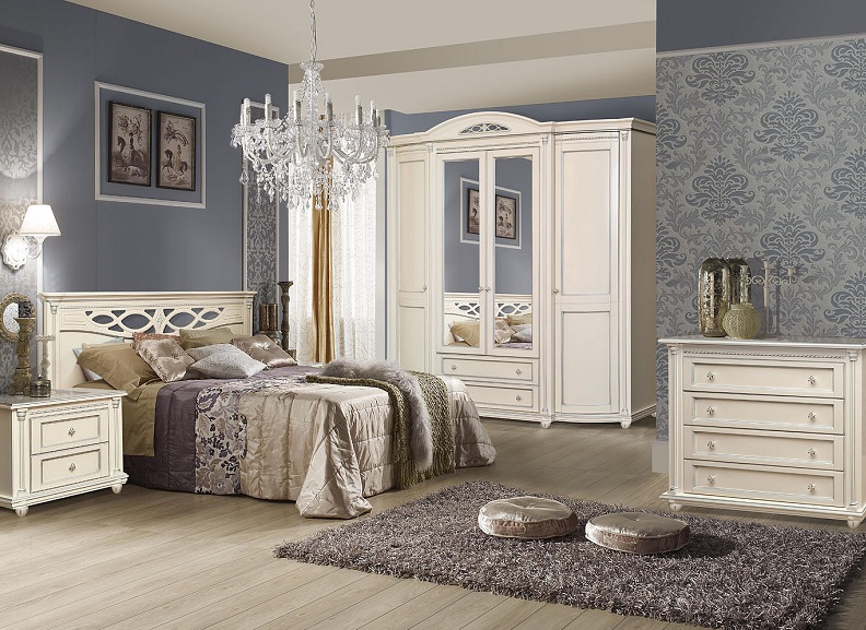 Состав комплекта: комод, шкаф, двуспальная кровать, тумба (2 шт).