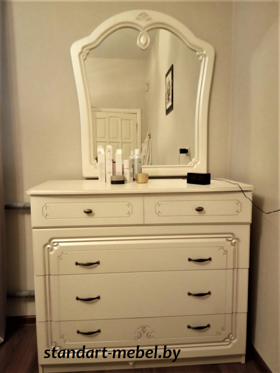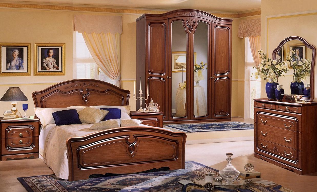 В комплекте: шкаф, кровать, комод, прикроватные тумбы.
