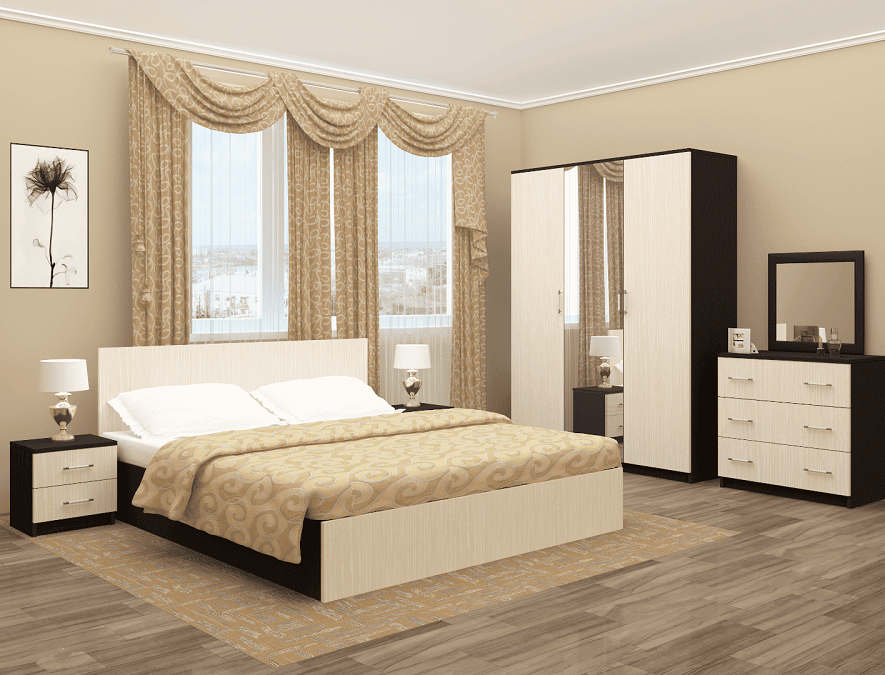 Набор для спальни состоит из просторной двуспальной кровати, главным украшением которой является прямое изголовье, трехстворчатого шкафа с высоким зеркалом, вместительного комода с выдвижными ящиками и двух прикроватных тумбочек. Фасад набора выполнен в бежевом и имеют очень приятную на ощупь древесную текстуру. Также все створки и выдвижные ящики дополнены современными прямыми ручками. Гарнитур прекрасно впишется как в небольшие, так и просторные помещения.