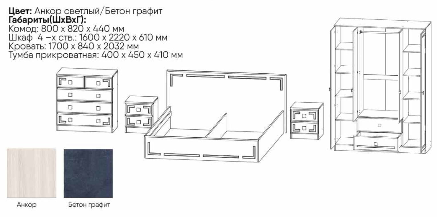 Спальный гарнитур «Верона» Комплект 1 - Анкор светлый/Бетон Графит (Рикко)