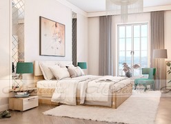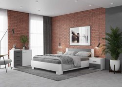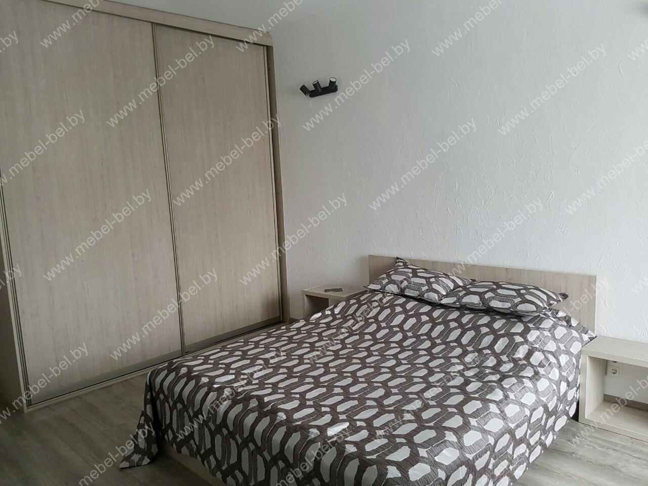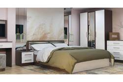 Спальный набор их удобной двуспальной кровати с тумбами и двустворчатого шкаф-купе. На кровати можно с комфортом отдохнуть после трудного дня. Для будильника, лампы и мелочи предусмотрены две тумбы. В шкафу-купе можно хранить постельное белье, одежду и всякие другие вещи.