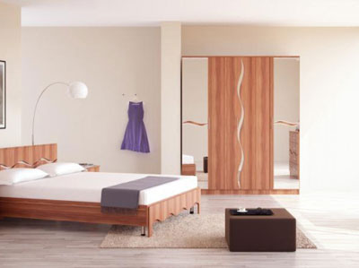 Комплектация: кровать двуспальная, тумба, шкаф двухстворчатый. Материал: ЛДСП.