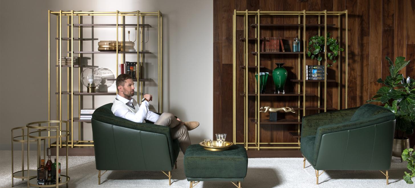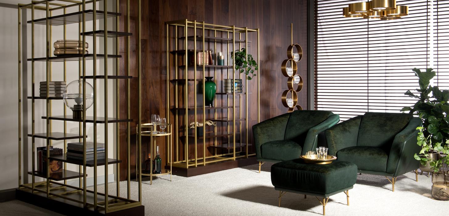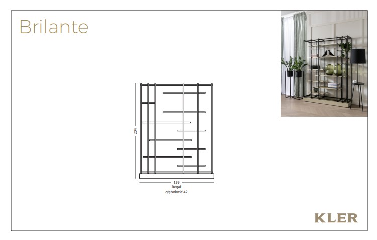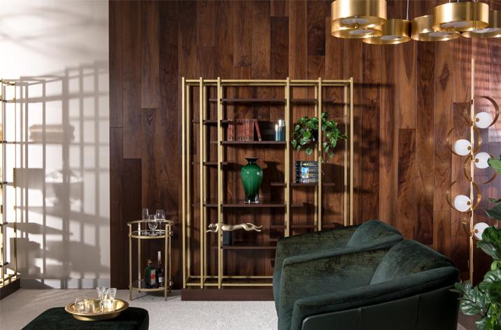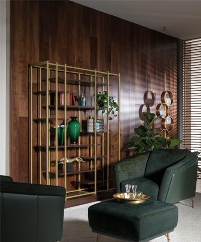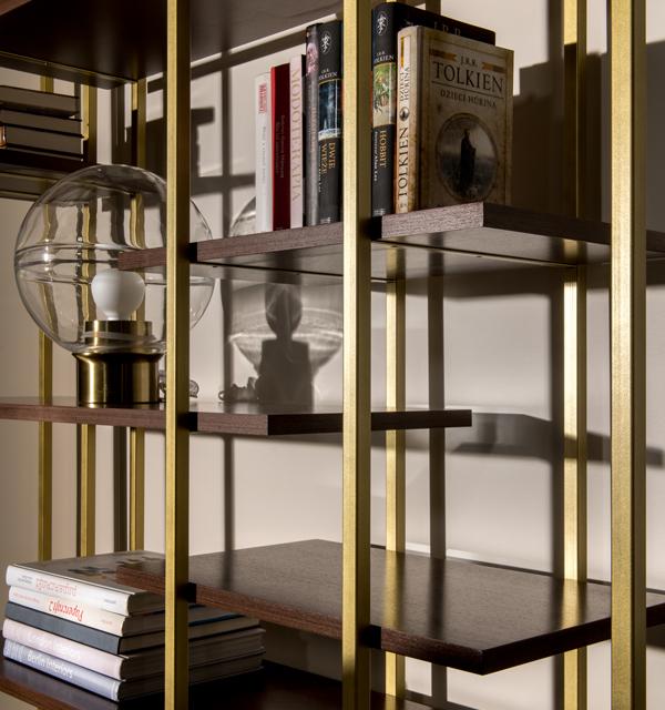 Стеллаж для гостиной, выполняющий исключительную декоративную функцию. Его форма — противоположность традиционному стеллажу. Он открыт со всех сторон, изготовлен из прямых металлических профилей 2х2 см., расположенных асимметрично (могут быть черного или золотого цвета). Горизонтальные полки установлены на вертикальном основании и размещены фантазийно. Отделаны полки натуральным шпоном американского ореха либо эмалью (выбор более десяти цветов, каждый с вариантом лакированного или матового покрытия). Они имеют разную длину и расположены на различной высоте. Встроенная в основание регулировка обеспечивает идеальное выравнивание всей конструкции. В стеллаже может также быть подсветка (опция): четыре светодиода на углах основания, которые светят вверх и создают приятную атмосферу. Мебель создана для ваших памятных сувениров, книг, коллекций статуэток или посуды.